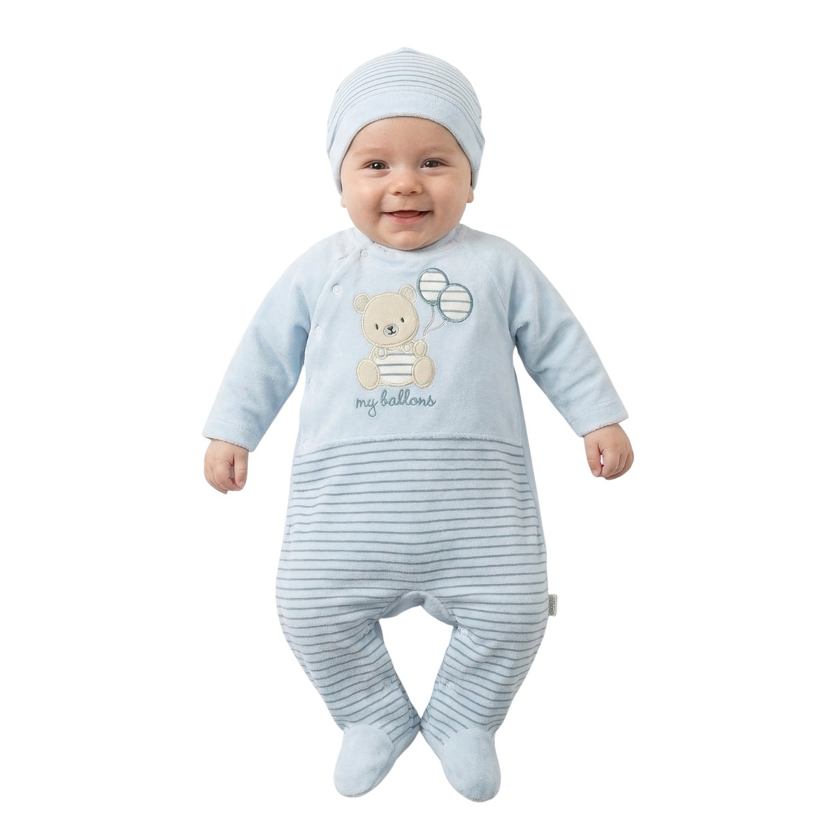 Annora Baby ολόσωμο βελουτέ φορμάκι με σκουφάκι «Blue Balloons»