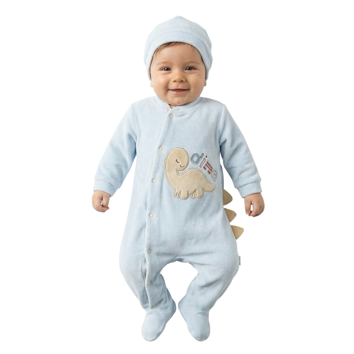 Annora Baby ολόσωμο βελουτέ φορμάκι με σκουφάκι «Blue Dino»