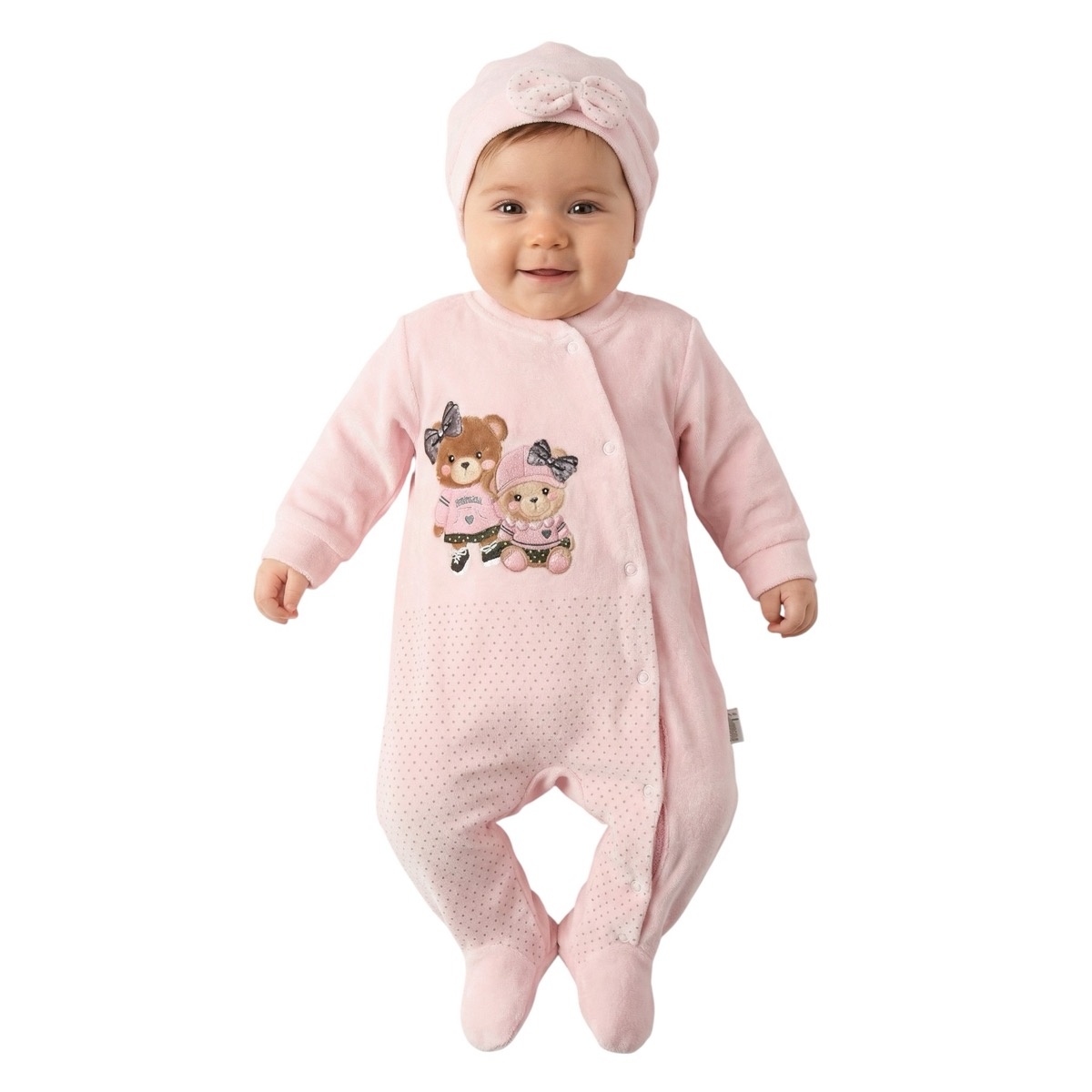 Annora Baby ολόσωμο βελουτέ φορμάκι με σκουφάκι «Little Ones in Pink»