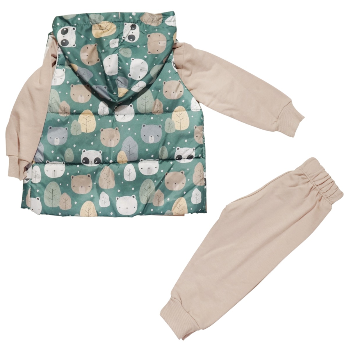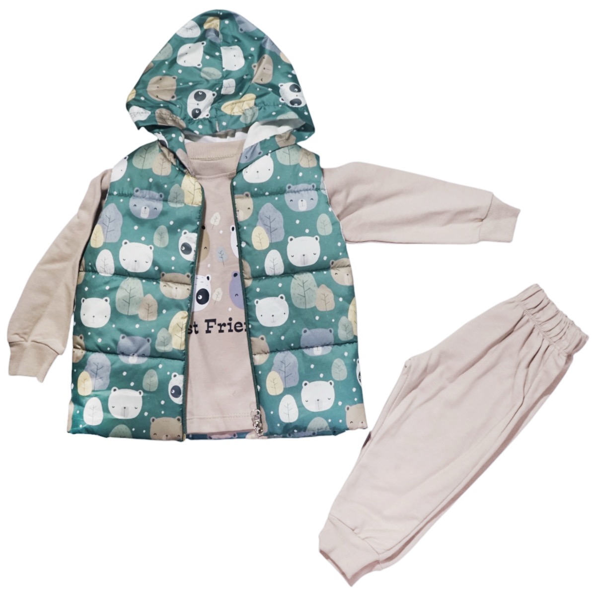 Το βρεφικό σετ τριών τεμαχίων της Ayidino είναι ιδανικό για τα αγοράκια. Περιλαμβάνει ένα πράσινο αντιανεμικό αμάνικο μπουφανάκι με σχέδια και κουκούλα, που ανοίγει με φερμουάρ στο εμπρός μέρος και διαθέτει εσωτερική επένδυση από 100% βαμβακερή φόδρα. Το μακρυμάνικο μπλουζάκι σε μπεζ απόχρωση έχει τύπωμα στο εμπρός μέρος, ενώ το παντελόνι διαθέτει λάστιχο περιμετρικά στη μέση και στο τελείωμα για άνετη εφαρμογή. Το μπουφάν είναι από 100% πολυεστέρα και το σετ από 100% βαμβάκι, προσφέροντας πρακτικότητα και στιλ για κάθε περίσταση. Ιδανικό για τις μεταβατικές εποχές της άνοιξης και του φθινοπώρου.