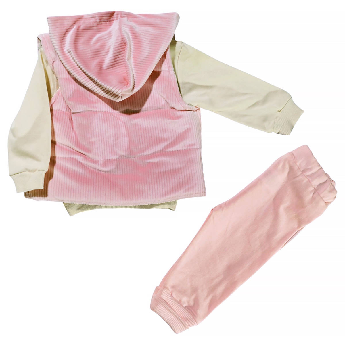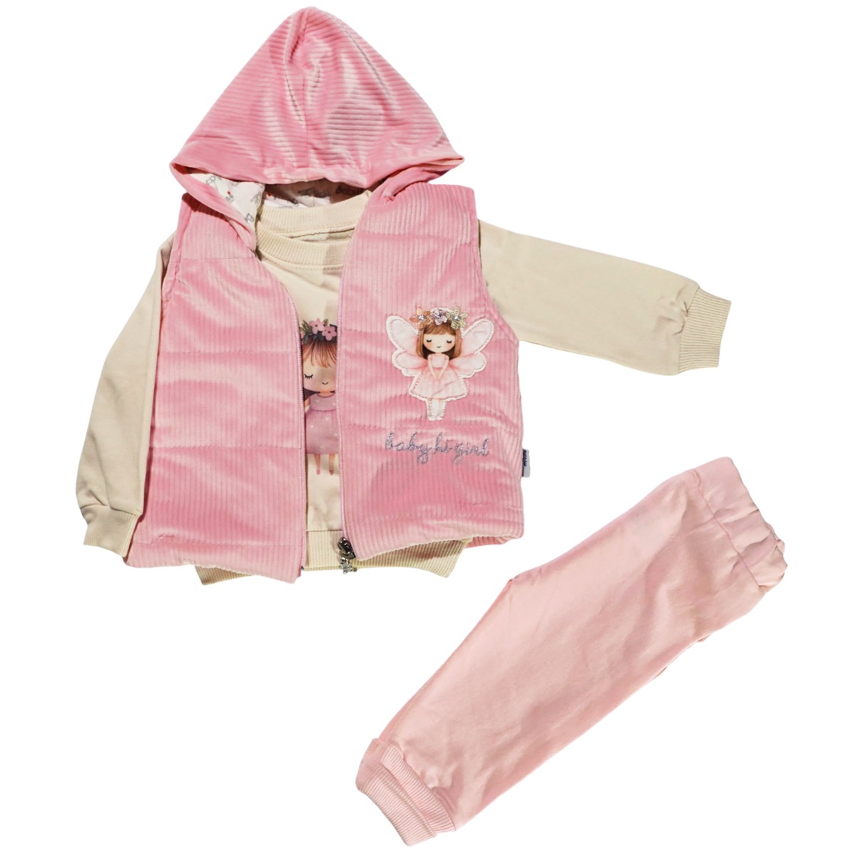 Το σετ τριών τεμαχίων της Baby Hi είναι η ιδανική επιλογή για τα κοριτσάκια σας την άνοιξη και το φθινόπωρο, συνδυάζοντας άνεση και πρακτικότητα. Το ροζ αμάνικο μπουφάν με κουκούλα είναι κατασκευασμένο από κοτλέ ύφασμα με εσωτερική επένδυση από βαμβακερή φόδρα και άνοιγμα με φερμουάρ. Η μπεζ μπλούζα είναι από λεπτό ύφασμα, διαθέτει όμορφο τύπωμα στο εμπρός μέρος και άνοιγμα με τρουκς στον ώμο για μεγαλύτερη άνεση. Το ροζ παντελόνι έχει λάστιχο περιμετρικά στη μέση για καλύτερη εφαρμογή και ρεβέρ στο τελείωμα για στιλάτη εμφάνιση. Το μπουφάν είναι από 50% βαμβάκι και 50% πολυεστέρα, ενώ η μπλούζα και το παντελόνι από 100% βαμβάκι, εξασφαλίζοντας απαλότητα, άνεση και κομψό στιλ για κάθε περίσταση.