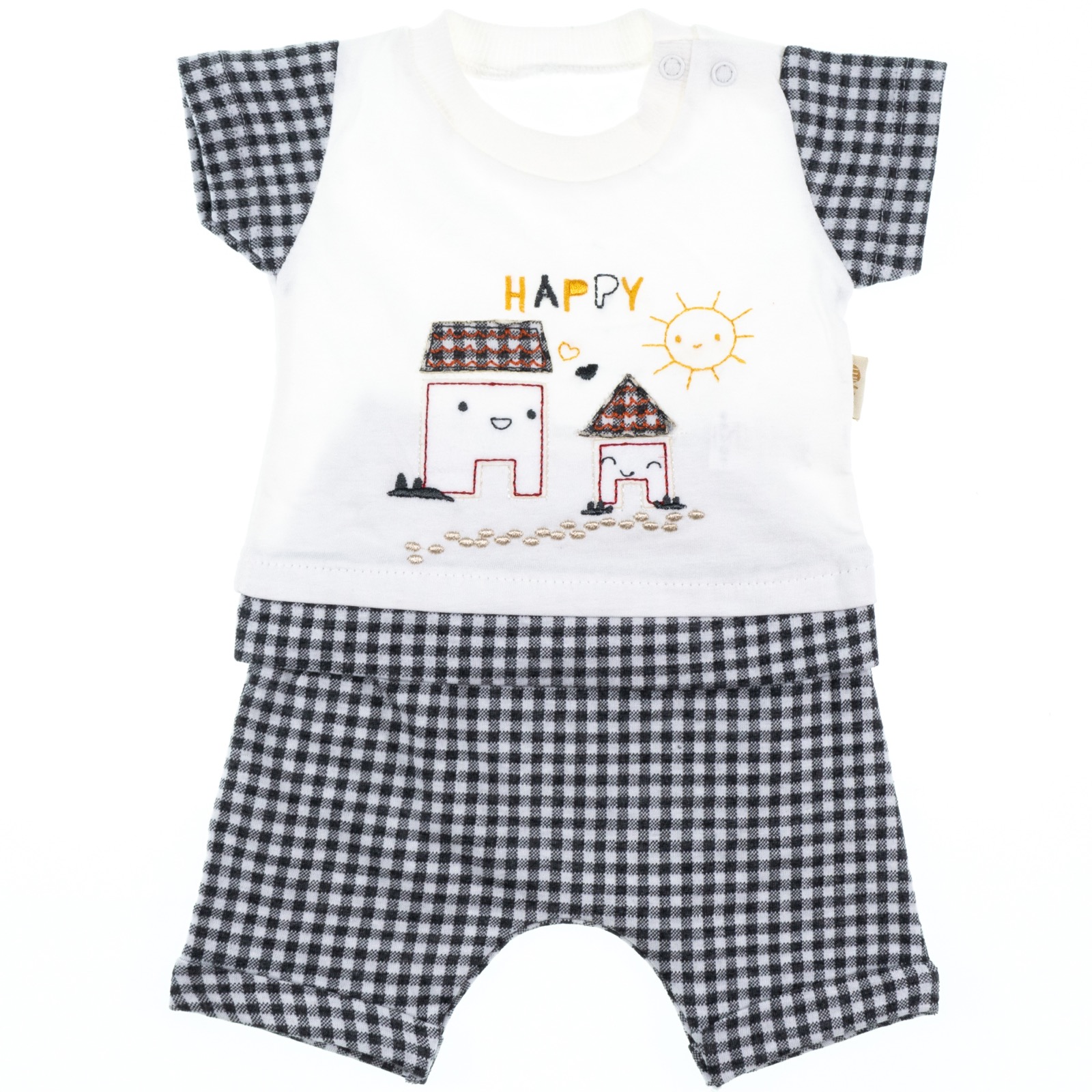 Ένα όμορφο σετάκι από 100% βαμβακερό ύφασμα. Κοντομάνικη μπλούζα με απλικέ σχέδια στο εμπρός μέρος και άνοιγμα με τρουκς στον ώμο. Σορτσάκι με ρεβέρ και λάστιχο περιμετρικά στη μέση.