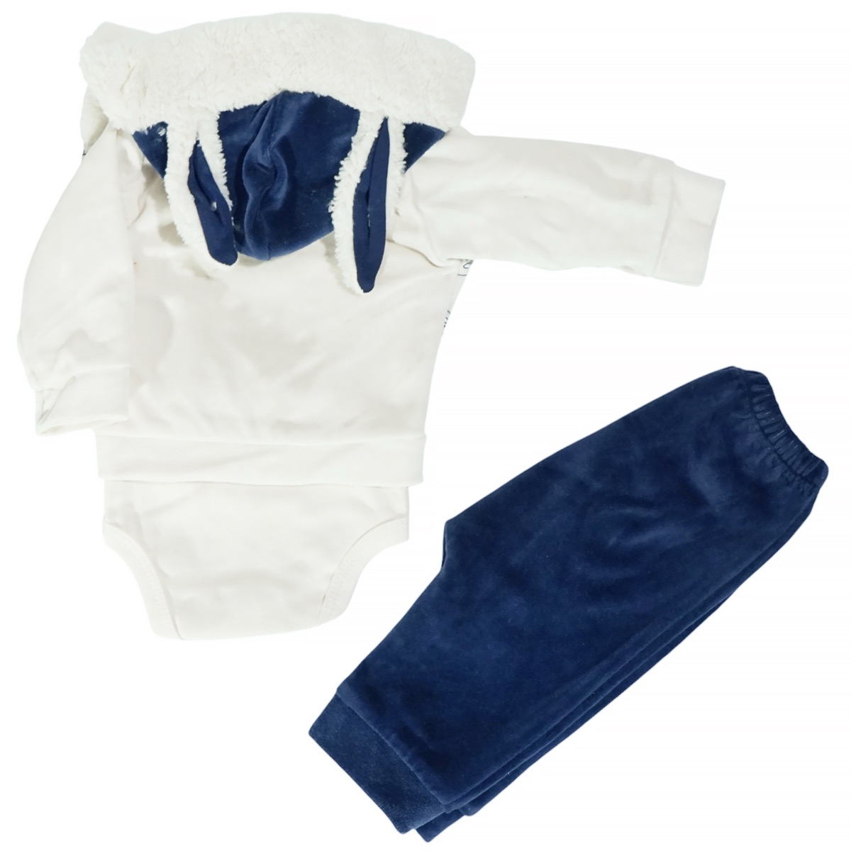 Το βρεφικό σετ τριών τεμαχίων της Babyim είναι η ιδανική επιλογή για τα αγοράκια σας τον χειμώνα, συνδυάζοντας ζεστασιά και άνεση. Η μπεζ βελουτέ ζακέτα διαθέτει όμορφα σχέδια στο εμπρός μέρος, μπλε κουκούλα με χαριτωμένα απλικέ σχεδιάκια και άνοιγμα με τρουκς για μεγαλύτερη πρακτικότητα. Το μπεζ κορμάκι έχει εντυπωσιακό κέντημα μπροστά και άνοιγμα με τρουκς στον ώμο και στο κάτω μέρος για εύκολη αλλαγή. Το μπλε βελουτέ παντελόνι διαθέτει λάστιχο περιμετρικά στη μέση και στο τελείωμα για άνετη εφαρμογή. Το κορμάκι είναι από 100% βαμβάκι, ενώ η ζακέτα και το παντελόνι από 80% βαμβάκι και 20% πολυεστέρα, εξασφαλίζοντας την απαλότητα που χρειάζεται η ευαίσθητη βρεφική επιδερμίδα και την προστασία από το κρύο για τις χειμερινές μέρες.
