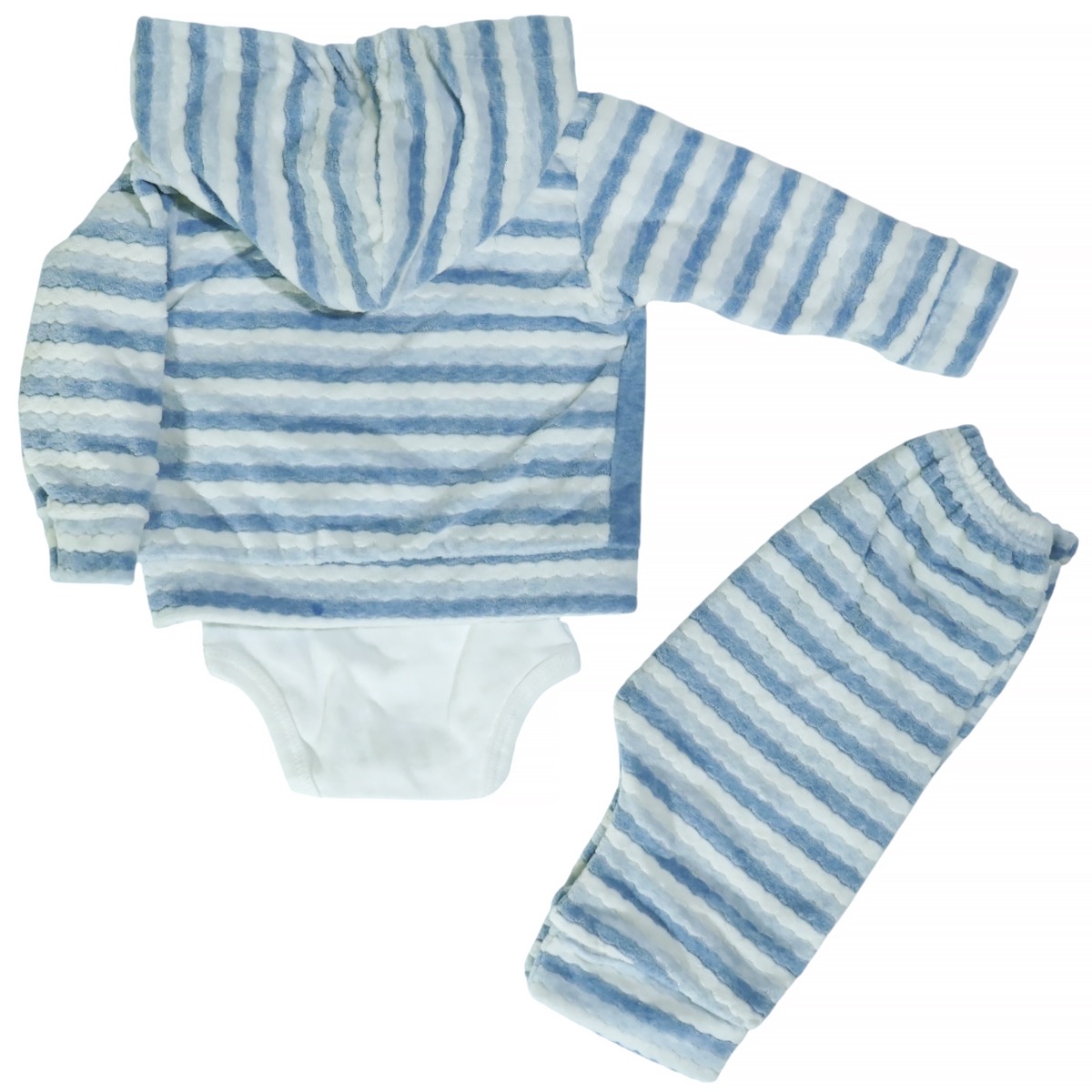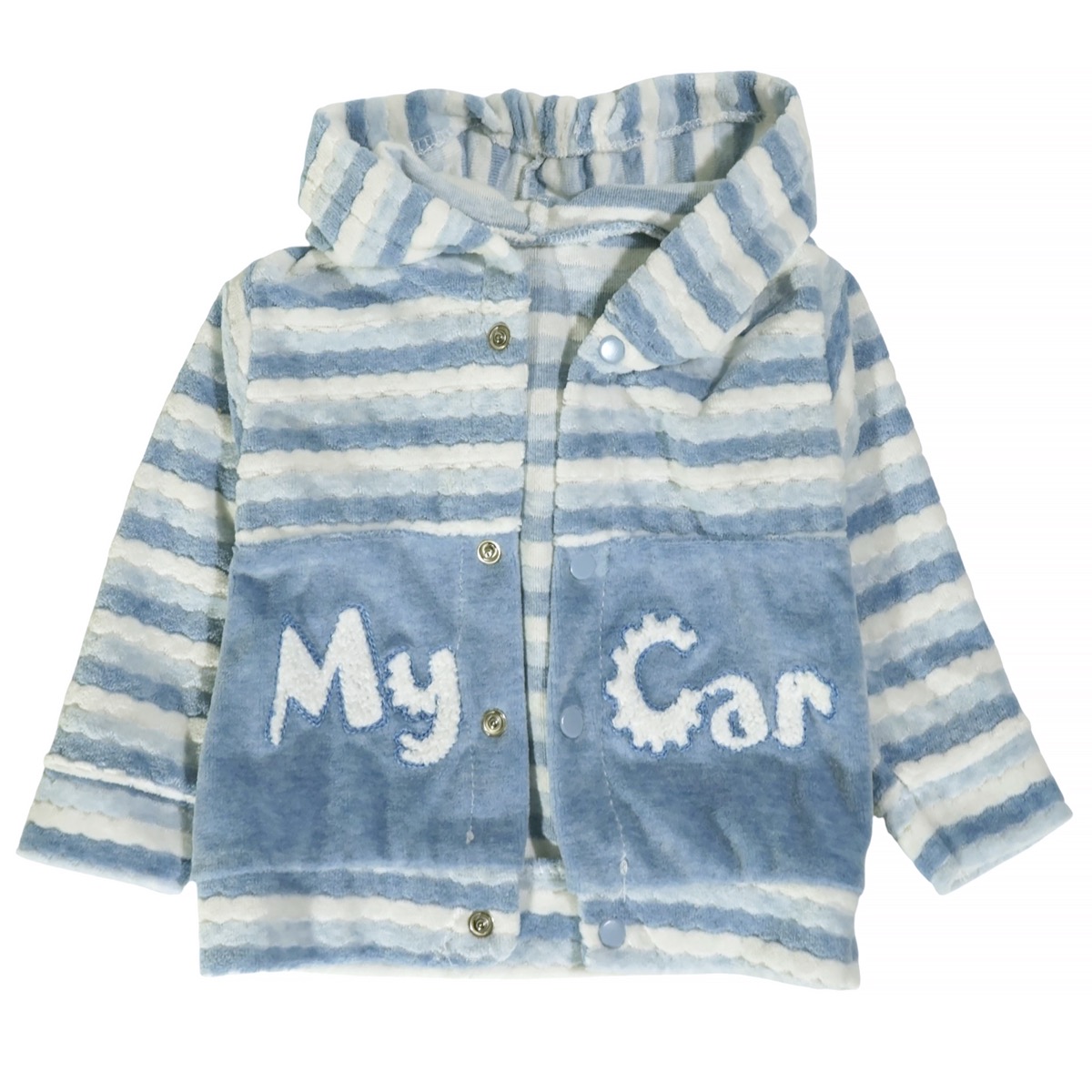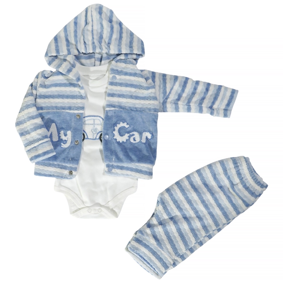 Το βρεφικό σετ τριών τεμαχίων της Babyim είναι η τέλεια επιλογή για τα αγοράκια σας τον χειμώνα, προσφέροντας ζεστασιά και πρακτικότητα. Η γαλάζια βελουτέ ζακέτα διαθέτει χαριτωμένα απλικέ σχέδια στο εμπρός μέρος, κουκούλα και άνοιγμα με τρουκς για μεγαλύτερη ευκολία. Το εκρού κορμάκι έχει όμορφο κέντημα μπροστά και άνοιγμα με τρουκς στον ώμο και στο κάτω μέρος για εύκολη αλλαγή. Το γαλάζιο βελουτέ παντελόνι διαθέτει λάστιχο περιμετρικά στη μέση για άνετη εφαρμογή. Το κορμάκι είναι από 100% βαμβάκι, ενώ η ζακέτα και το παντελόνι από 80% βαμβάκι και 20% πολυεστέρα, εξασφαλίζοντας την απαλότητα που χρειάζεται η ευαίσθητη βρεφική επιδερμίδα και την ζεστασιά για τις κρύες χειμερινές μέρες.