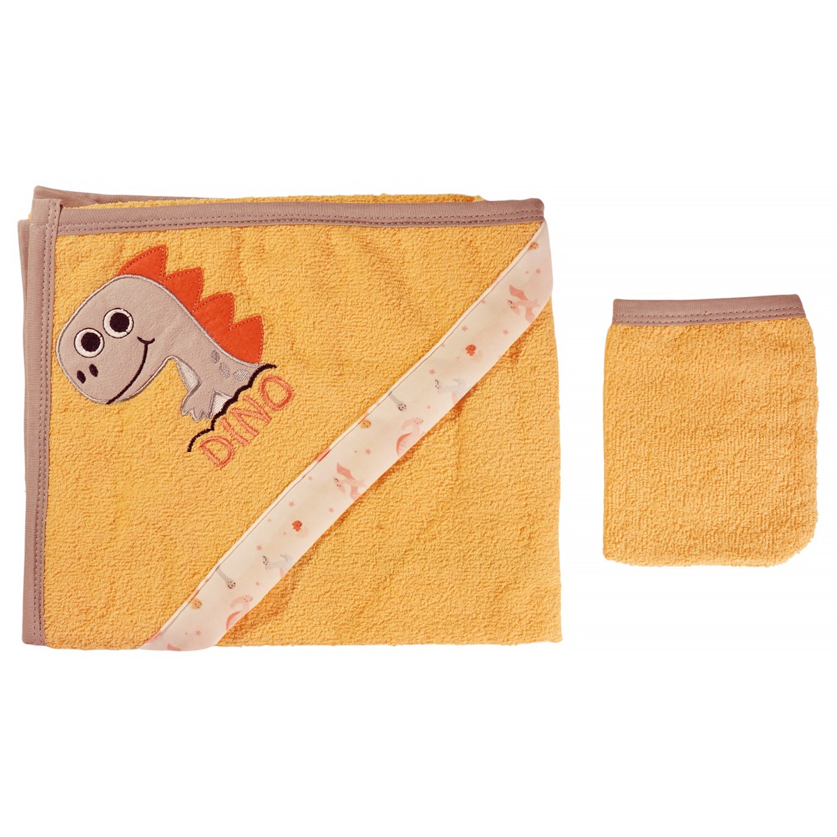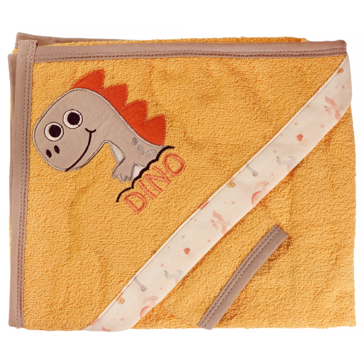 Η βρεφική μπουρνουζοπετσέτα με γαντάκι μπάνιου Buude Kids σε ζωηρό κίτρινο χρώμα χαρίζει χαρά και άνεση στο καθημερινό μπάνιο του μωρού σας. Η κουκούλα με απλικέ δεινοσαυράκι προσθέτει παιχνιδιάρικη διάθεση, ενώ το γαντάκι μπάνιου κάνει την περιποίηση πιο εύκολη και πρακτική. Η σύνθεση από 80% βαμβάκι και 20% πολυεστέρα συνδυάζει μαλακή υφή, απορροφητικότητα και αντοχή, προσφέροντας στο μωρό σας προστασία και φροντίδα μετά το μπάνιο. Ένα όμορφο και λειτουργικό σετ που απευθύνεται σε αγοράκια, ιδανικό και ως δώρο για νεογέννητα.