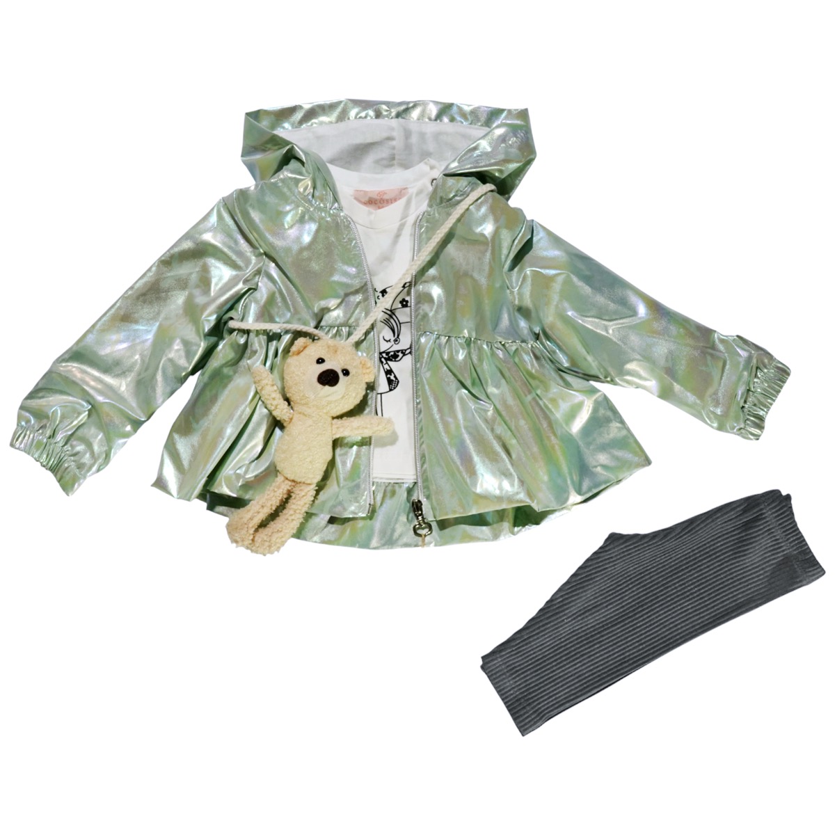 Το σετ τεσσάρων τεμαχίων της Cocosiss είναι η ιδανική επιλογή για τα κοριτσάκια σας την άνοιξη και το φθινόπωρο, προσφέροντας ολοκληρωμένο και πρακτικό ντύσιμο. Το πράσινο μπουφάν με κουκούλα είναι κατασκευασμένο από αδιάβροχο ύφασμα με εσωτερική επένδυση από βαμβακερή φόδρα και άνοιγμα με φερμουάρ για προστασία από τη βροχή. Η εκρού μπλούζα είναι από λεπτό ύφασμα, διαθέτει όμορφο τύπωμα στο εμπρός μέρος και άνοιγμα με τρουκς στον ώμο. Το γκρι κολάν έχει λάστιχο περιμετρικά στη μέση για άνετη εφαρμογή, ενώ το σετ συνοδεύεται από ένα χαριτωμένο λούτρινο κρεμαστό αρκουδάκι σε καφέ χρώμα. Το μπουφάν είναι από 100% πολυεστέρα, ενώ η μπλούζα και το κολάν από 100% βαμβάκι, εξασφαλίζοντας άνεση, προστασία και στιλ σε κάθε περίσταση.