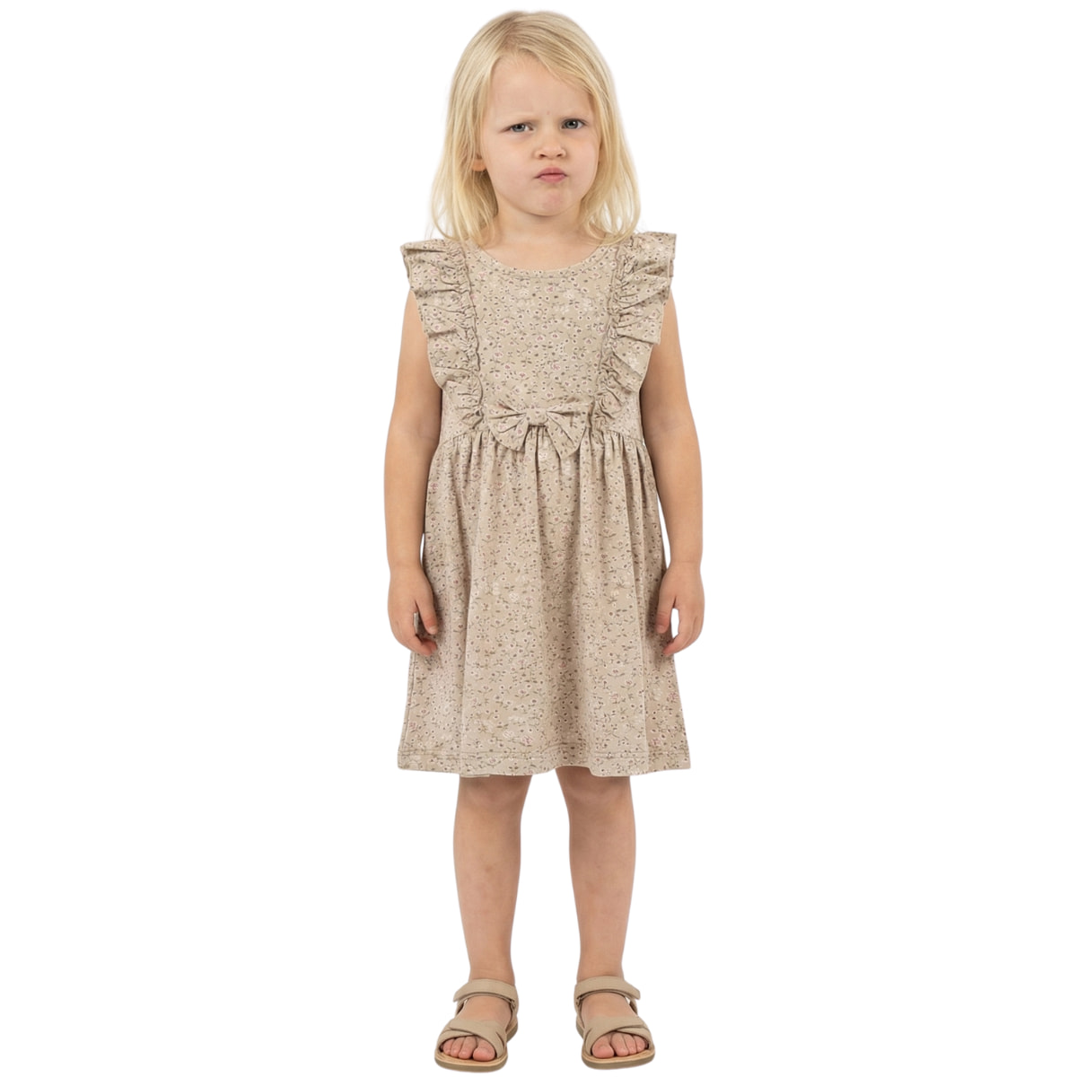 Το μακό φορεματάκι από τη Deco Kids είναι μια απόλυτα δροσερή και ρομαντική επιλογή που θα γεμίσει χαρά τις καλοκαιρινές ημέρες των κοριτσιών σας. Η απαλή μπεζ απόχρωσή του αναδεικνύεται μοναδικά μέσα από το υπέροχο, χαρούμενο μοτίβο με λουλουδάκια που απλώνεται σε όλη την επιφάνεια του ρούχου, χαρίζοντας μια γλυκιά και φρέσκια εικόνα. Η αμάνικη γραμμή του επιτρέπει στο σώμα να αναπνέει ελεύθερα, ενώ ο όμορφος διακοσμητικός φιόγκος στο μπροστινό μέρος προσθέτει μια κομψή πινελιά που το κάνει να ξεχωρίζει σε κάθε εμφάνιση. Είναι η ιδανική πρόταση για τις καθημερινές βόλτες, τα πάρτι ή τις διακοπές, καθώς συνδυάζει την αισθητική με την απόλυτη άνεση. Η σύνθεσή του από 95% βαμβάκι και 5% ελαστάνη αγκαλιάζει απαλά το ευαίσθητο παιδικό δέρμα, προσφέροντας την απαραίτητη ελαστικότητα ώστε η μικρή σας να κινείται και να παίζει ξέγνοιαστα κάτω από τον ήλιο.