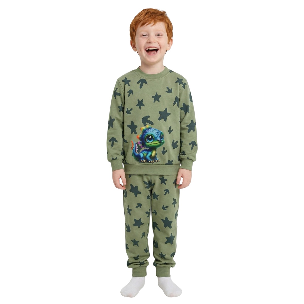 Η Dreams πιτζάμα για αγόρια σε ζωηρή πράσινη απόχρωση προσφέρει άνεση και πρακτικότητα με χαριτωμένο σχεδιασμό. Η μακρυμάνικη μπλούζα με στάμπα ένα γλυκό δράκο στο εμπρός μέρος, διαθέτει λάστιχο στο λαιμό, στα μανίκια και στο τελείωμα για σωστή εφαρμογή χωρίς ενοχλήσεις. Επιπλέον, το παντελόνι έχει λάστιχο περιμετρικά στη μέση και στο τελείωμα, διασφαλίζοντας ότι μένει στη θέση του κατά το παιχνίδι και τον ύπνο. Επειδή είναι φτιαγμένη από 100% βαμβάκι, χαρίζει απαλή αίσθηση στο δερματάκι και αντέχει στο καθημερινό πλύσιμο, επομένως είναι ιδανική επιλογή για χειμώνα, άνοιξη και φθινόπωρο, προσθέτοντας στιλ στο νυχτερινό ντύσιμο του μικρού.