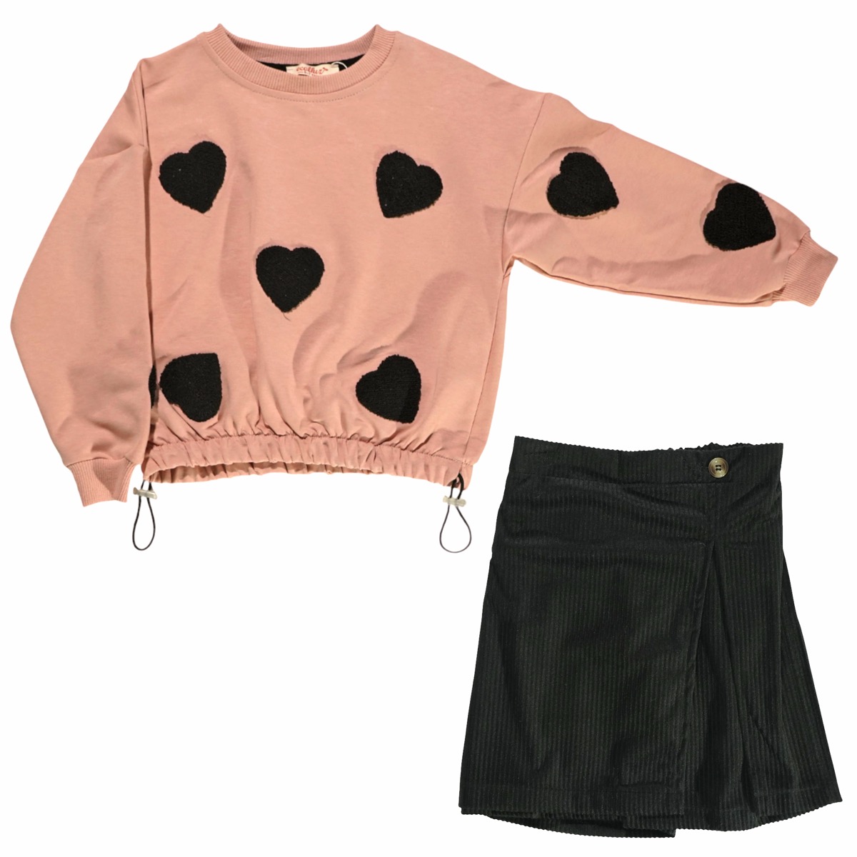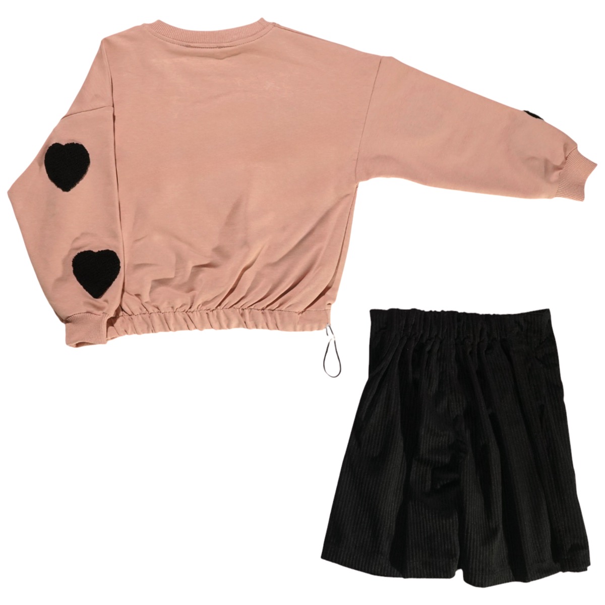 Το σετ της Ecolkiz με σομόν μπλούζα και μαύρο σκόρτς είναι ο ιδανικός συνδυασμός για την άνοιξη και το φθινόπωρο. Περιλαμβάνει μια όμορφη μπλούζα από λεπτό βαμβακερό ύφασμα με απλικέ καρδούλες στο εμπρός μέρος και λάστιχο που αυξομειώνει στο τελείωμα, καθώς και ένα κομψό σορτσάκι-φούστα από ύφασμα κοτλέ με λάστιχο στο πίσω μέρος της μέσης. Η μπλούζα είναι κατασκευασμένη από 70% βαμβάκι, 29% πολυεστέρα και 1% λύκρα, ενώ το σκόρτς από 100% βαμβάκι. Οι απλικέ καρδούλες προσθέτουν μια τρυφερή πινελιά, ενώ το κοτλέ ύφασμα του μαύρου σκόρτς δημιουργεί έναν στιλάτο συνδυασμό. Ένα ολοκληρωμένο σετ που θα φορέσει η κόρη σας με χαρά σε κάθε καθημερινή της δραστηριότητα.