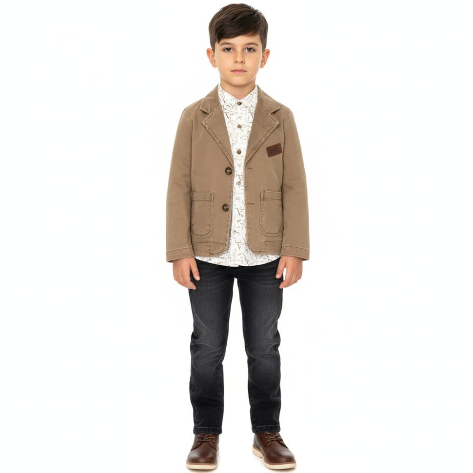 Αναδείξτε την παιδική μόδα με το μοναδικό σετ τριών τεμαχίων από την Efbey Kids, σχεδιασμένο για τον μικρό σας κύριο. Το κομψό καφέ τζιν σακάκι, με πρακτικές τσέπες και κουμπιά, συνδυάζεται άψογα με το μοντέρνο μαύρο τζιν παντελόνι, το οποίο διαθέτει εσωτερικό λάστιχο για άνετη εφαρμογή. Το highlight του σετ είναι το άσπρο πουκάμισο με εντυπωσιακά all-over σχέδια, προσδίδοντας έναν αέρα παιχνιδιάρικης κομψότητας.