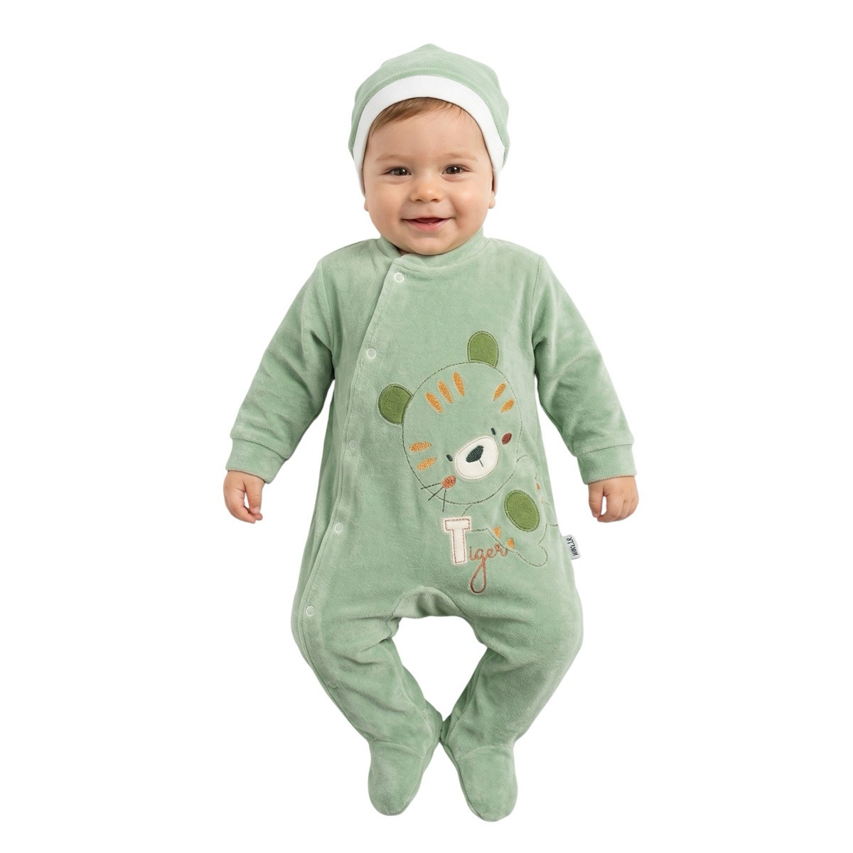 Το ολόσωμο βελουτέ φορμάκι της Efilix Baby σε βεραμάν χρώμα συνδυάζει άνεση και πρακτικότητα για τον χειμώνα. Φτιαγμένο από βελουτέ βαμβακερό ύφασμα με σύνθεση 80% βαμβάκι και 20% πολυεστέρα, προσφέρει ζεστασιά και απαλή αίσθηση στο αγοράκι σας. Τα απλικέ σχέδια στο εμπρός μέρος δίνουν παιχνιδιάρικη νότα, ενώ το άνοιγμα με τρουκς από πάνω έως κάτω στο πλάι κάνει το ντύσιμο γρήγορο και εύκολο. Το σετ περιλαμβάνει ασορτί σκουφάκι που κρατά το κεφαλάκι του μωρού ζεστό και προστατευμένο.
