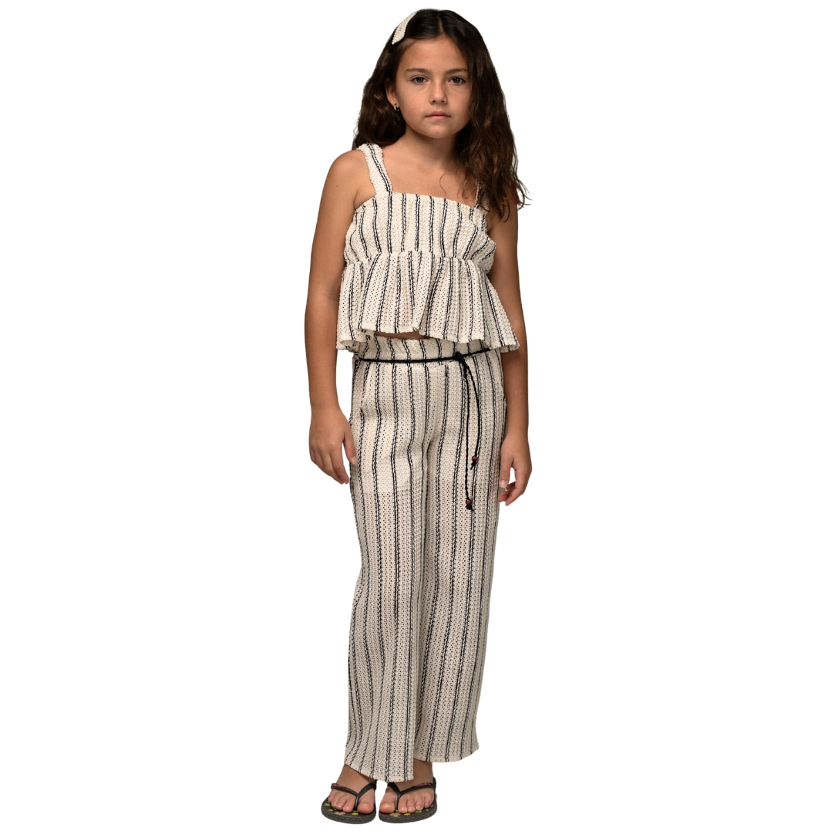 Το εκρού crochet σετ είναι μια γλυκιά επιλογή για το καλοκαίρι, για τις μικρές σας που θέλουν να νιώθουν λίγο πιο «κυρίες» στις βόλτες και στις γιορτές. Το μπουστάκι έχει λάστιχο περιμετρικά στο επάνω μέρος για σταθερή εφαρμογή, ενώ το βολάν στο τελείωμα δίνει όμορφη κίνηση και μια παιχνιδιάρικη πινελιά. Η παντελόνα είναι άνετη για περπάτημα και παιχνίδι, με τσέπες για τα μικρά τους πραγματάκια και ζώνη που δένει μπροστά ώστε να τη ρυθμίζετε όπως σας βολεύει. Η μέση με λάστιχο περιμετρικά βοηθά να κάθεται σωστά όλη μέρα. Η σύνθεση από 50% βαμβάκι και 50% πολυεστέρα κάνει το σετ πρακτικό για συχνή χρήση και ταιριάζει υπέροχα με σανδάλια και ένα ψάθινο καπελάκι.