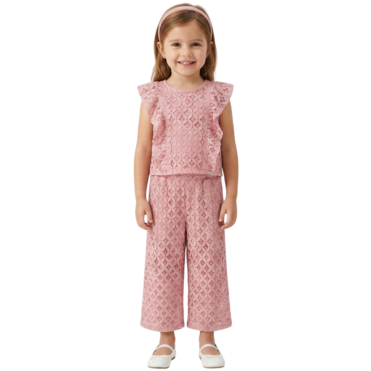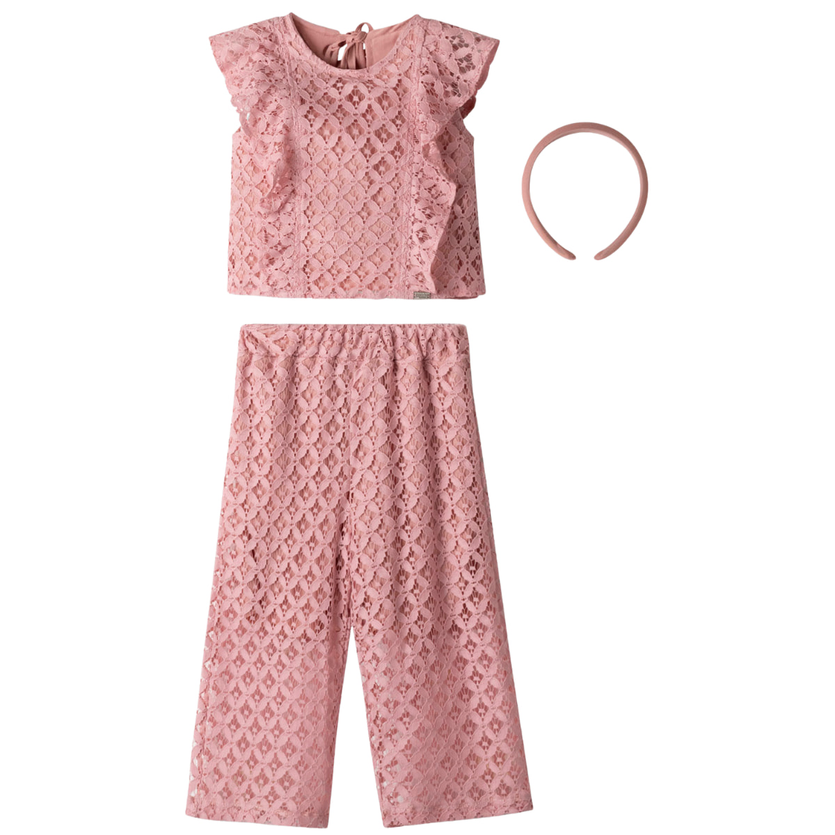 Αυτό το ρομαντικό καλοκαιρινό σετ από την Εβίτα θα χαρίσει μοναδικό στιλ στις εμφανίσεις που θα κάνουν τα κοριτσάκια σας. Το σύνολο σε ροζ χρώμα αποτελείται από ένα αμάνικο τοπάκι με εντυπωσιακό εξώπλατο σχέδιο, το οποίο δένει στο επάνω μέρος και κλείνει με κουμπάκια χαμηλά, ενώ στολίζεται με έναν όμορφο διακοσμητικό φιόγκο στην πλάτη. Συνοδεύεται από μια άνετη παντελόνα με λάστιχο περιμετρικά στη μέση για άψογη εφαρμογή και ευκολία. Το ιδιαίτερο χαρακτηριστικό του συνόλου είναι το ύφασμα με το κοφτό κέντημα που υπάρχει παντού προσδίδοντας φινέτσα, ενώ η εσωτερική επένδυση με βαμβακερή φόδρα φροντίζει για την κάλυψη και την απαλή αίσθηση στο δέρμα. Η σύνθεση από 65% βαμβάκι και 35% πολυεστέρα καθιστά το ρούχο ανθεκτικό και δροσερό. Είναι μια κομψή επιλογή που θα κάνει τις μικρές σας να ξεχωρίζουν στις καλοκαιρινές τους βόλτες.