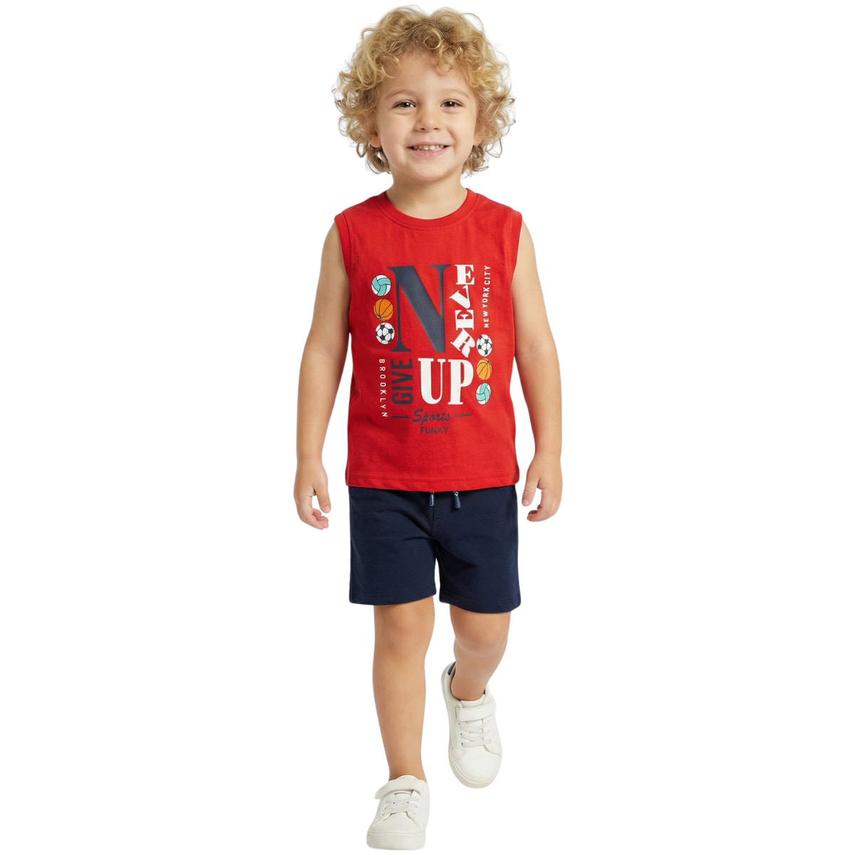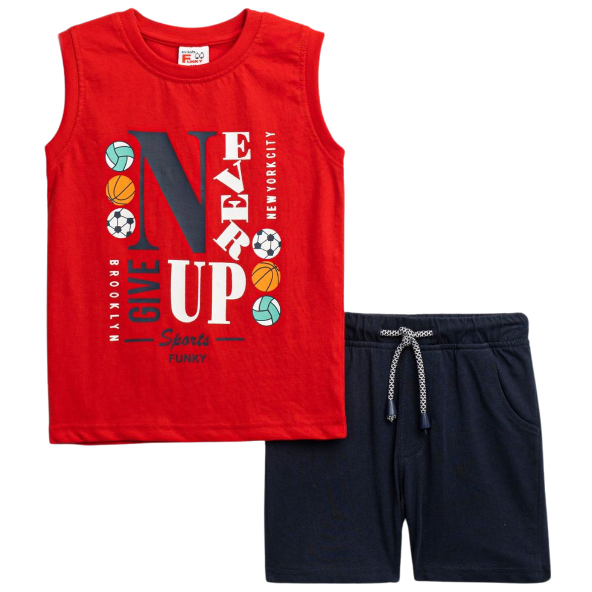 Το καλοκαιρινό σετ από τη Funky με αμάνικη μπλούζα και σορτσάκι είναι μια άνετη και πρακτική επιλογή για τα αγοράκια σας τις ζεστές μέρες. Η κόκκινη μπλούζα είναι αμάνικη, με χαρούμενο τύπωμα στο εμπρός μέρος, ώστε τα μικρά σας να νιώθουν ανάλαφρα και να έχουν ένα παιχνιδιάρικο στιλ σε κάθε τους δραστηριότητα. Το μπλε σορτσάκι διαθέτει τσέπες για καθημερινή ευκολία, κορδόνι που δένει μπροστά και λάστιχο γύρω γύρω στη μέση για σταθερή και άνετη εφαρμογή όλη μέρα. Το σετ είναι φτιαγμένο από 100% βαμβάκι, απαλό για την παιδική επιδερμίδα και ιδανικό για τον καλοκαιρινό καιρό, είτε για βόλτα είτε για παιχνίδι.