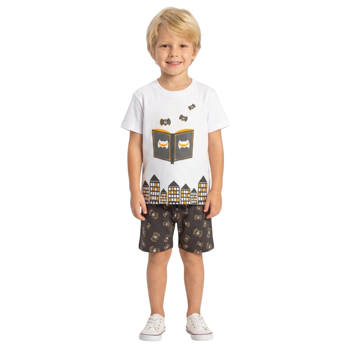 Το σετ Funky για αγοράκια είναι η απόλυτη καλοκαιρινή επιλογή για άνεση και στυλ! Η λευκή μπλούζα από 100% βαμβάκι διαθέτει εντυπωσιακό τύπωμα στο μπροστινό μέρος, δίνοντας μια μοντέρνα και παιχνιδιάρικη πινελιά. Το γκρι σορτσάκι, με all-over σχέδιο και τσέπες, προσθέτει μοναδικό χαρακτήρα στο σύνολο, ενώ το κορδόνι που δένει εμπρός και το λάστιχο στη μέση εξασφαλίζουν σταθερή και άνετη εφαρμογή. Ελαφρύ, δροσερό και πρακτικό, αυτό το σετ είναι ιδανικό για καθημερινές βόλτες, παιχνίδι και καλοκαιρινές περιπέτειες. Ένα must-have outfit για τους μικρούς πρωταγωνιστές του καλοκαιριού!
