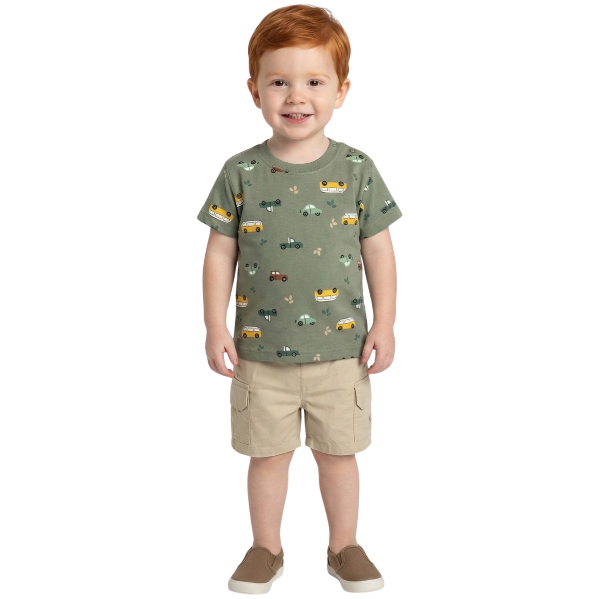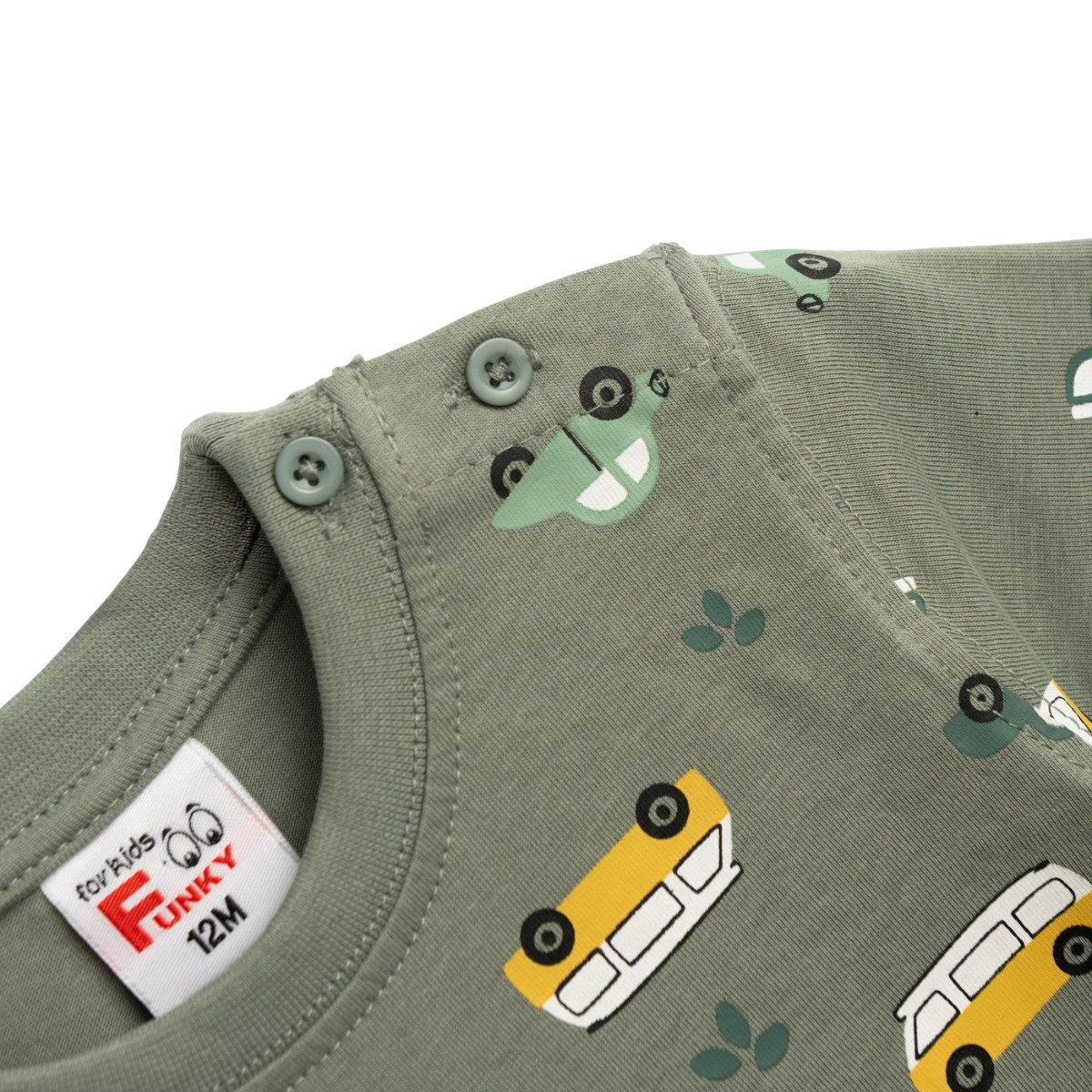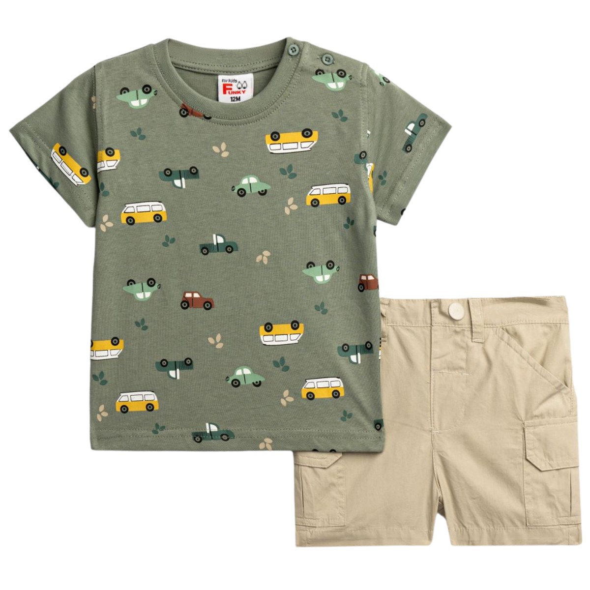 Το βρεφικό σετ από τη Funky είναι μια πολύ γλυκιά επιλογή για τα καλοκαιρινά σας μωράκια. Η πράσινη μπλούζα έχει σχέδιο με μικρά αυτοκινητάκια σε όλη την επιφάνεια, χαρίζοντας έναν παιχνιδιάρικο χαρακτήρα που ταιριάζει υπέροχα στους μικρούς οδηγούς σας. Τα κουμπάκια στον ώμο βοηθούν ώστε να ντύνετε το μωρό σας απαλά και χωρίς δυσκολία. Το μπεζ σορτσάκι ολοκληρώνει όμορφα το σύνολο, με τσέπες για πιο προσεγμένη εικόνα, λάστιχο περιμετρικά στη μέση για άνετη εφαρμογή και τρουκ εμπρός που προσθέτει μια πρακτική λεπτομέρεια. Η σύνθεση από 100% βαμβάκι φροντίζει το ευαίσθητο δερματάκι του, προσφέροντας δροσιά και απαλότητα σε κάθε κίνηση. Ένα σετάκι που αγκαλιάζει το μωρό σας με άνεση στις βόλτες, στο καρότσι ή στο παιχνίδι.