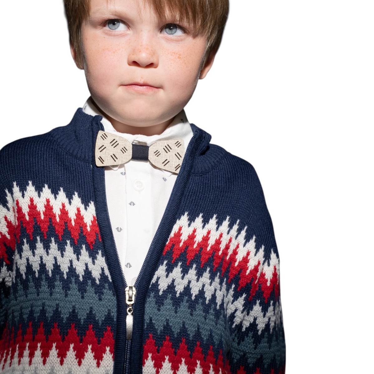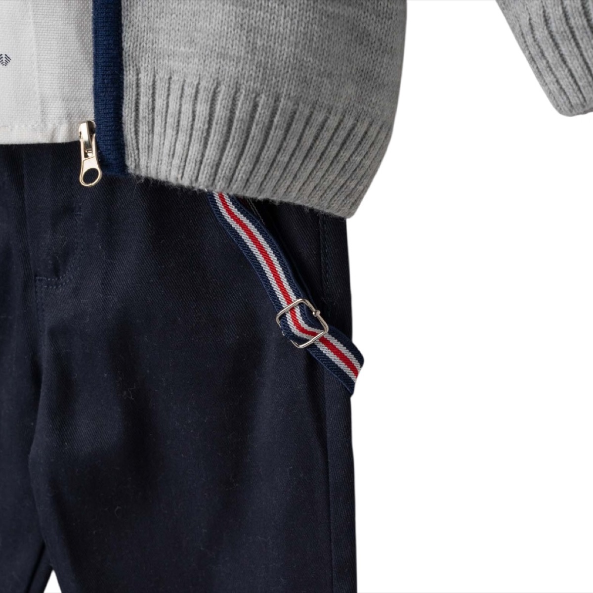 Το αμπιγιέ σετ πέντε τεμαχίων Hashtag αποτελεί ιδανική επιλογή για γονείς που θέλουν να ντύσουν με στυλ και άνεση τα αγόρια τους τον χειμώνα. Το σετ περιλαμβάνει γκρι πλεκτή ζακέτα με φερμουάρ στο εμπρός μέρος από 100% ακρυλικό, εκρού πουκάμισο με διακριτικά σχέδια από 55% βαμβάκι και 45% πολυεστέρα και μπλε παντελόνι με τσέπες εμπρός και πίσω, άνοιγμα με κουμπί και φερμουάρ, καθώς και εσωτερικό λάστιχο για ρύθμιση της μέσης, κατασκευασμένο από 97% βαμβάκι και 3% λύκρα. Οι τιράντες και το ξύλινο παπιγιόν με λάστιχο ολοκληρώνουν το αμπιγιέ σύνολο, προσφέροντας ένα ολοκληρωμένο, μοντέρνο και πρακτικό ντύσιμο για τις χειμερινές επίσημες εμφανίσεις. Ιδανικό για κάθε μικρό αγόρι που ζητάει στιλ και άνεση σε ποιοτικά παιδικά ρούχα.