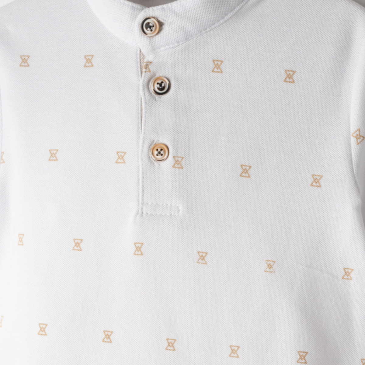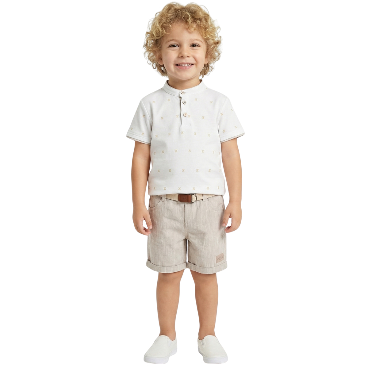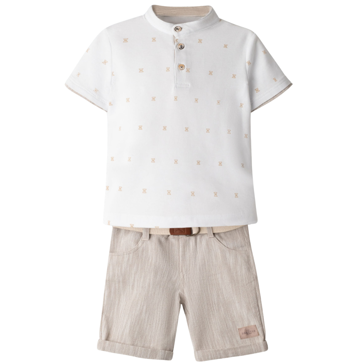Αυτό το κομψό καλοκαιρινό σετ από τη Hashtag αποτελεί μια εξαιρετική επιλογή για τις βόλτες και τις επίσημες εμφανίσεις του παιδιού σας. Το επάνω μέρος αποτελείται από μπλούζα σε εκρού απόχρωση με μοντέρνο μαο γιακά και διακριτικό σχέδιο σε όλη την επιφάνεια, με κλείσιμο με κουμπιά μπροστά. Συνδυάζεται όμορφα με την μπεζ βερμούδα που διαθέτει την όψη λινού υφάσματος, καθώς και πρακτικές τσέπες στην μπροστινή και πίσω όψη. Για να εφαρμόζει σωστά στη μέση των μικρών σας αγοριών, το παντελονάκι έχει εσωτερικό κορδόνι αυξομείωσης, ενώ η ασορτί υφασμάτινη ζώνη ολοκληρώνει το προσεγμένο στιλ. Το σύνολο είναι κατασκευασμένο από 100% βαμβάκι, προσφέροντας δροσιά και άνεση στο δέρμα τους κατά τους ζεστούς μήνες.