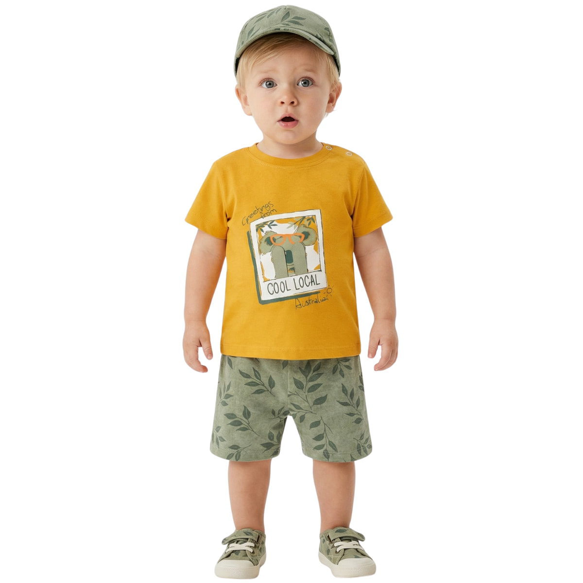 Το βρεφικό σετ από τη Hashtag με μπλούζα, σορτσάκι και καπελάκι είναι μια όμορφη καλοκαιρινή επιλογή για τα αγοράκια σας. Η κοντομάνικη μουσταρδί μπλούζα, από 100% βαμβάκι, έχει τύπωμα και απλικέ σχέδια στο μπροστινό μέρος, δίνοντας παιχνιδιάρικη διάθεση, ενώ το άνοιγμα με τρουκς στον ώμο βοηθά στο εύκολο ντύσιμο των μικρών σας. Το πράσινο σορτσάκι διαθέτει άνετο λάστιχο περιμετρικά στη μέση, ώστε να εφαρμόζει καλά χωρίς να πιέζει την ευαίσθητη κοιλίτσα. Το καπελάκι τζόκεϊ, επίσης σε πράσινο χρώμα, ολοκληρώνει το σετ, προσφέροντας πρακτική προστασία από τον ήλιο στις καλοκαιρινές βόλτες. Ένα ολοκληρωμένο σύνολο για κάθε μέρα, που συνδυάζει άνεση και απαλότητα για το δερματάκι του μωρού.