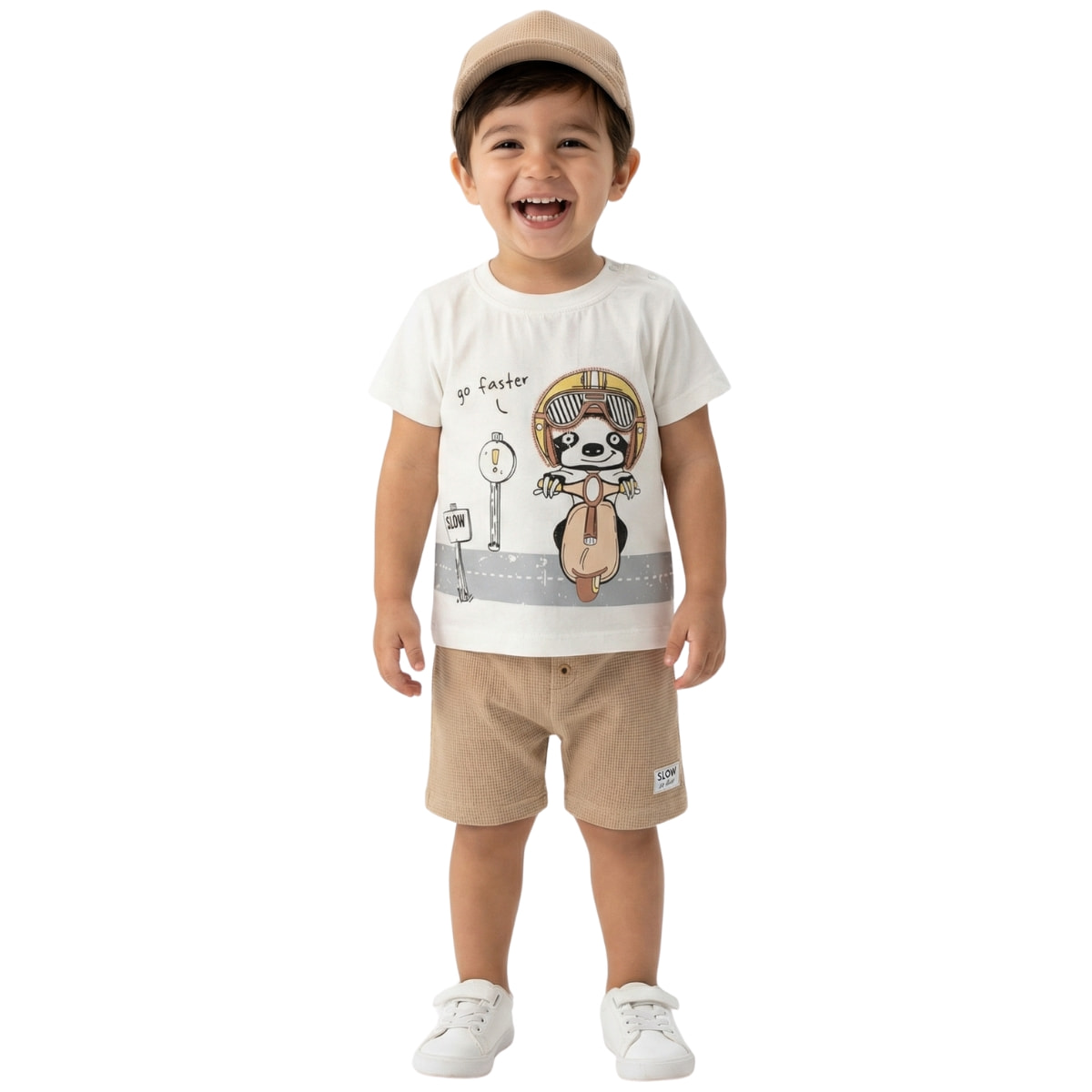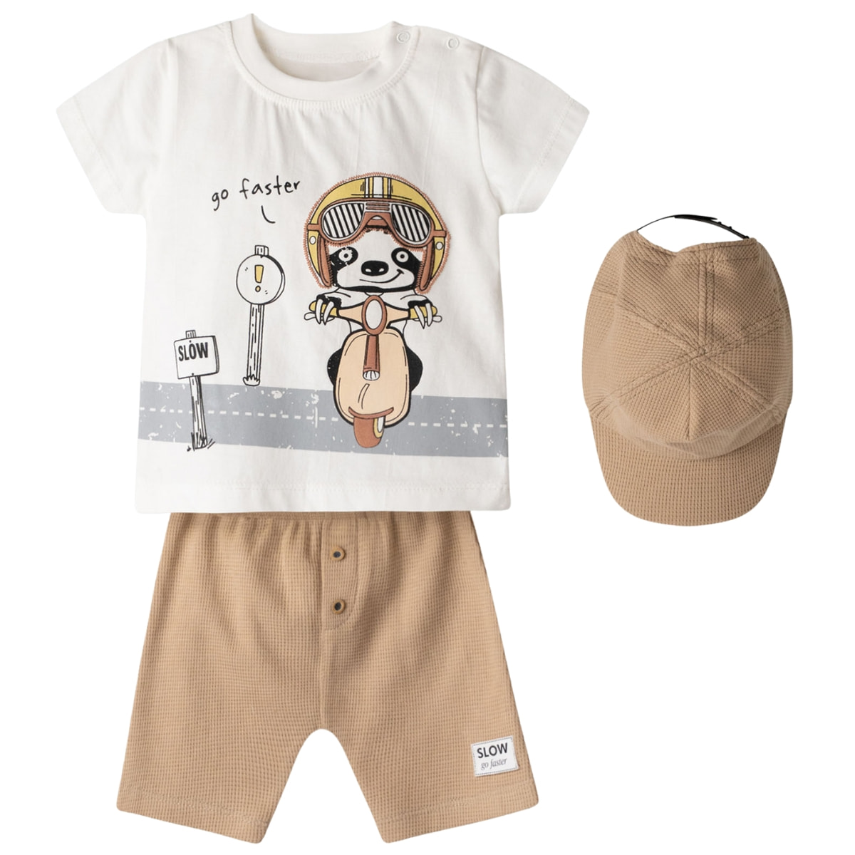 Βρεφικό σετ τριών τεμαχίων Hashtag για αγόρια, ιδανικό για τις καλοκαιρινές εμφανίσεις του μικρού σας. Περιλαμβάνει εκρού μπλούζα με χαριτωμένο τύπωμα μπροστά και άνοιγμα με τρουκς στον ώμο, ώστε να ντύνετε το μωρό πιο εύκολα, χωρίς ταλαιπωρία. Συνδυάζεται με καφέ σορτσάκι με άνετο λάστιχο στη μέση που δεν πιέζει την κοιλίτσα και ακολουθεί τις κινήσεις του, καθώς και ταιριαστό καπελάκι για έξτρα προστασία από τον ήλιο και ολοκληρωμένο στιλ στις βόλτες. Όλα τα κομμάτια είναι φτιαγμένα από 100% βαμβάκι, φιλικό προς την ευαίσθητη βρεφική επιδερμίδα, ώστε το παιδί να νιώθει δροσερό και άνετο όλη μέρα.