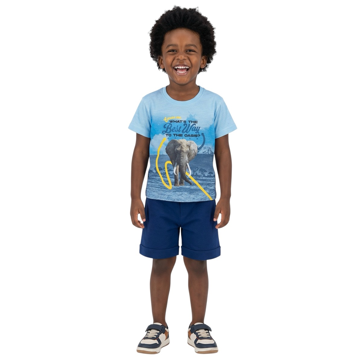 Το καλοκαιρινό σετ Joyce για αγοράκια συνδυάζει παιχνιδιάρικο στυλ και άνεση! Η γαλάζια μπλούζα από 100% βαμβάκι διαθέτει χαριτωμένο τύπωμα με ελέφαντα στο μπροστινό μέρος, δημιουργώντας μια διασκεδαστική και χαρούμενη εμφάνιση. Η μπλε βερμούδα από το ίδιο ύφασμα είναι ελαφριά και αέρινη, εξασφαλίζοντας δροσερή αίσθηση και απόλυτη ελευθερία κινήσεων. Το λάστιχο στη μέση προσφέρει ιδανική εφαρμογή χωρίς να πιέζει, καθιστώντας το σετ τέλειο για ατελείωτο παιχνίδι, βόλτες και καλοκαιρινές περιπέτειες. Ένα μοντέρνο και πρακτικό σύνολο που δεν πρέπει να λείπει από την παιδική γκαρνταρόμπα!