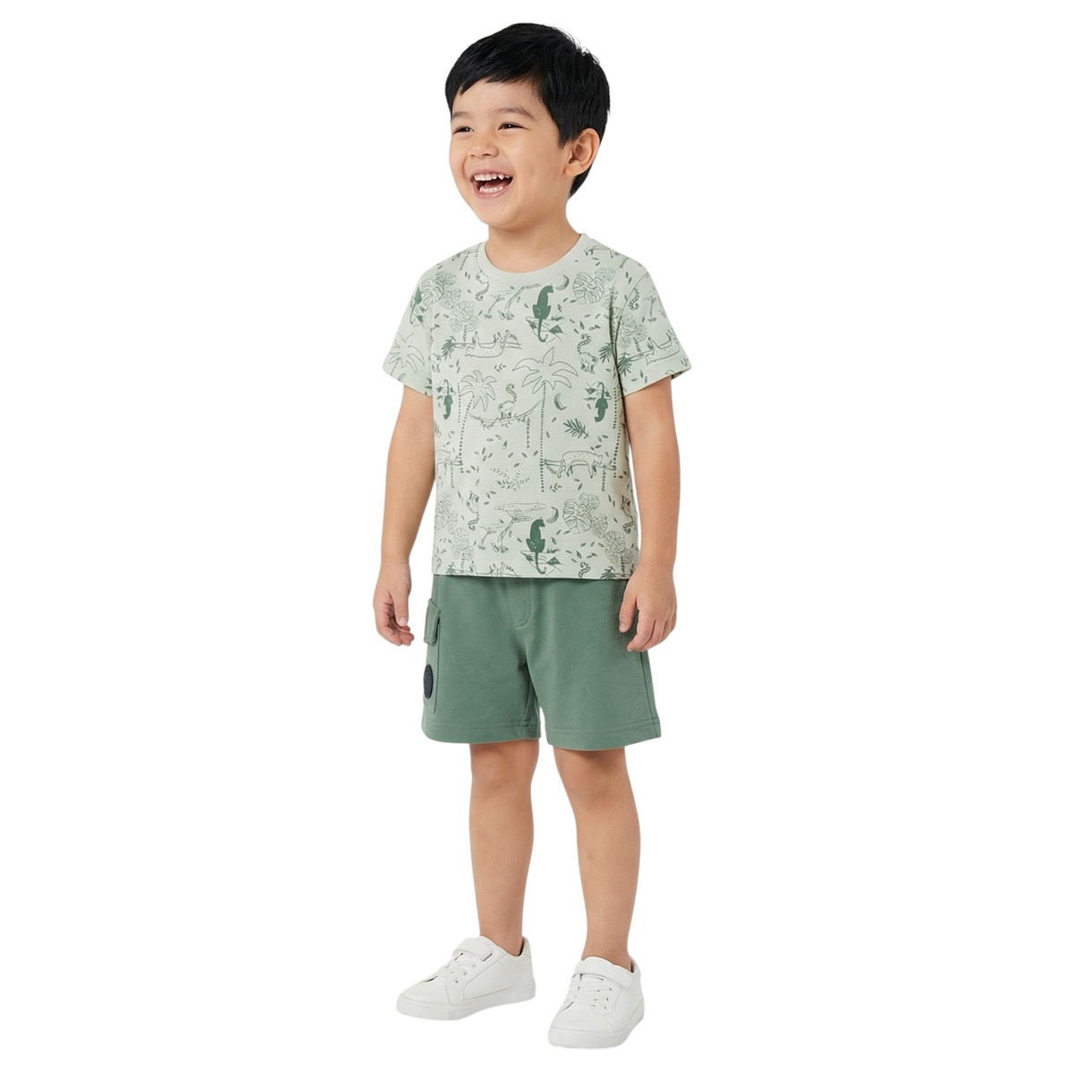 Δροσερό, μοντέρνο και ιδανικό για το καλοκαίρι, το σετ Joyce για αγοράκια ξεχωρίζει με τον παιχνιδιάρικο σχεδιασμό του! Η πράσινη μπλούζα με all-over τύπωμα χαρίζει μοναδικό στυλ, ενώ η βερμούδα με ψεύτικη τσέπη και λάστιχο στη μέση εξασφαλίζει άνετη εφαρμογή και ελευθερία κινήσεων. Κατασκευασμένο από 100% βαμβάκι, αυτό το σετ προσφέρει αέρινη αίσθηση, ιδανική για τις ζεστές μέρες. Είτε για βόλτες είτε για παιχνίδι, αποτελεί την τέλεια επιλογή για ένα φρέσκο και πρακτικό καλοκαιρινό look!