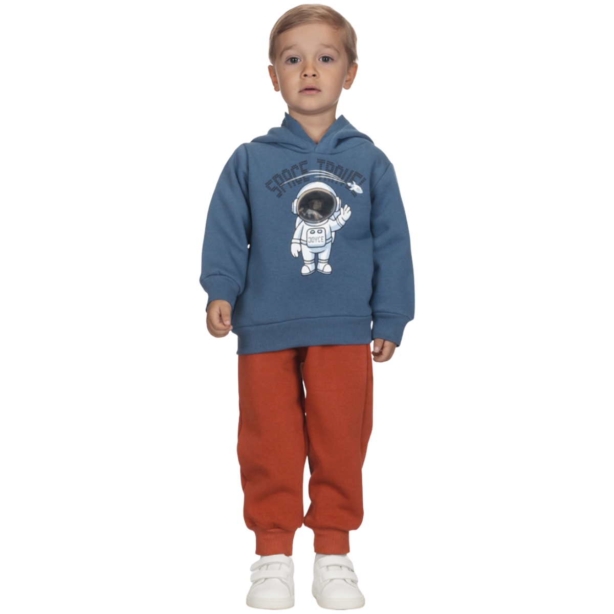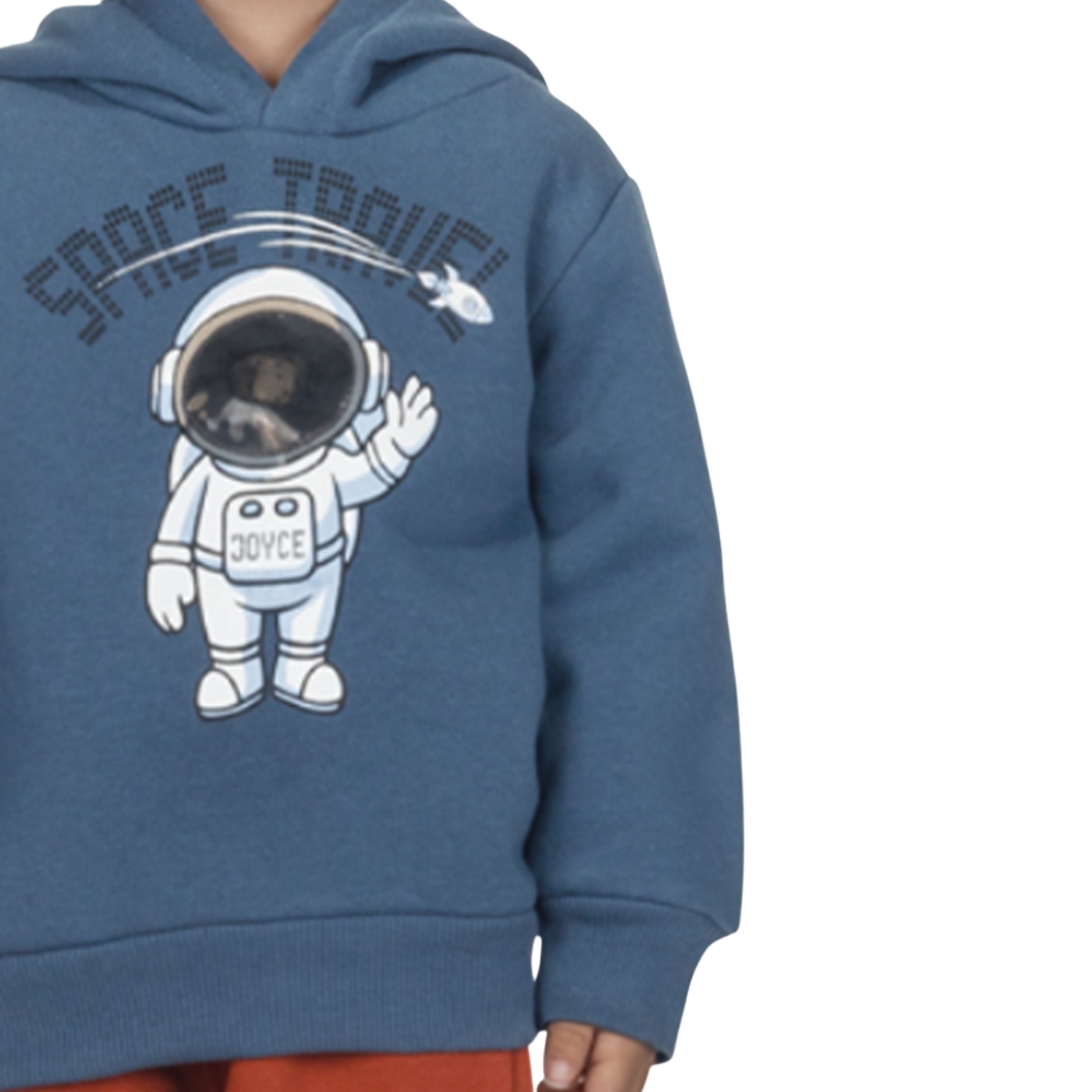 Το παιδικό σετ φόρμας της Joyce συνδυάζει πρακτικότητα και μοντέρνο σχέδιο για τον χειμώνα. Η μπλε μπλούζα με κουκούλα είναι κατασκευασμένη από φούτερ ύφασμα με απαλή επένδυση με χνούδι που προσφέρει ζεστασιά και άνεση. Το εντυπωσιακό τύπωμα αστροναύτη με φωτάκι που αναβοσβήνει όταν το πατάς δίνει μια διασκεδαστική νότα που θα λατρέψει κάθε αγόρι. Διαθέτει λάστιχο στα μανίκια και στο τελείωμα για άψογη εφαρμογή. Το καφέ παντελόνι, επίσης από φούτερ με εσωτερική επένδυση με χνούδι, εξασφαλίζει ελευθερία κινήσεων και λάστιχο στη μέση και στους αστραγάλους για σταθερό κράτημα. Με σύνθεση 80% βαμβάκι και 20% πολυεστέρα, το σετ αυτό είναι η ιδανική επιλογή για παιχνίδι και καθημερινές εξόδους.