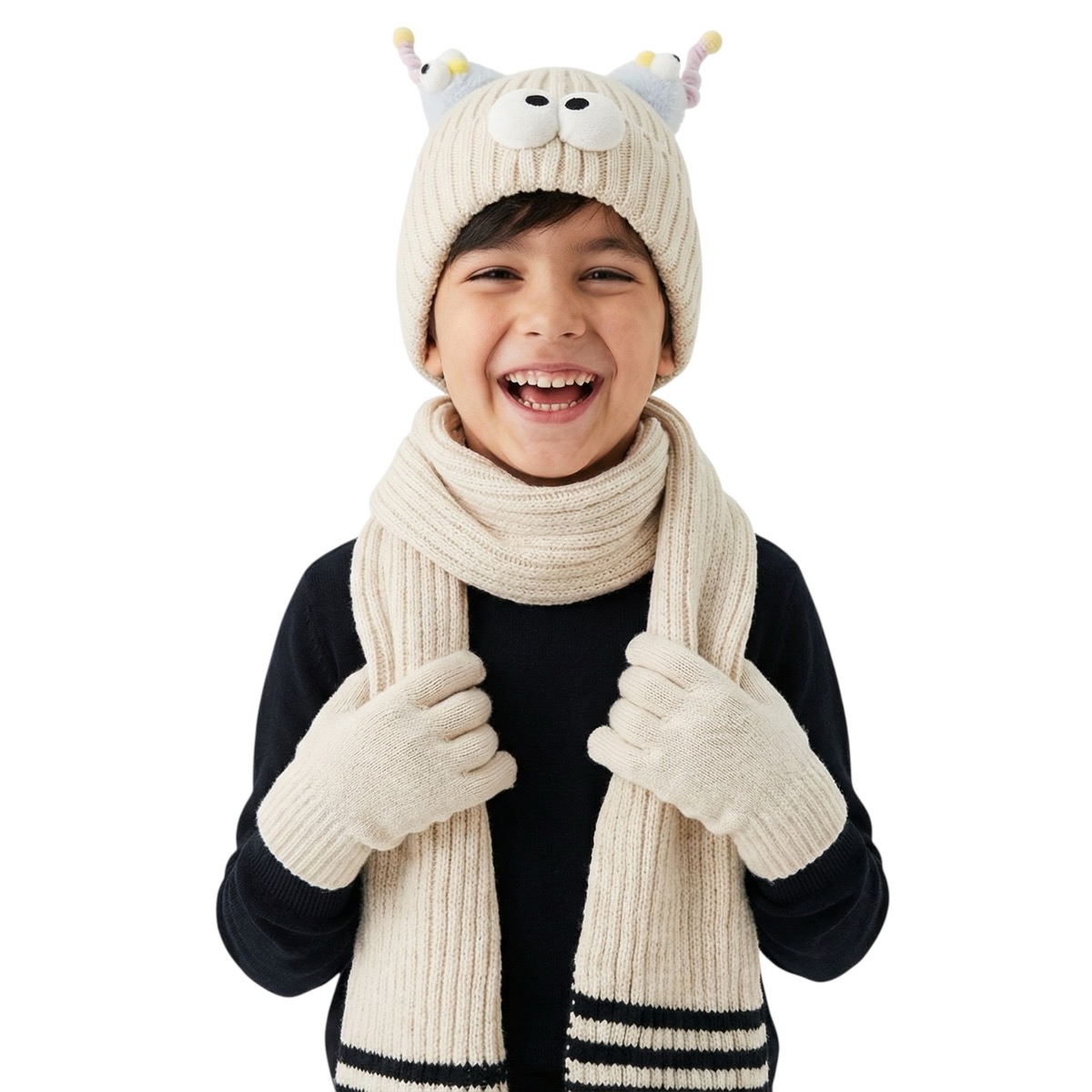 Kitti πλεκτό σετ σκούφος-κασκόλ-γάντια «Beige Face»