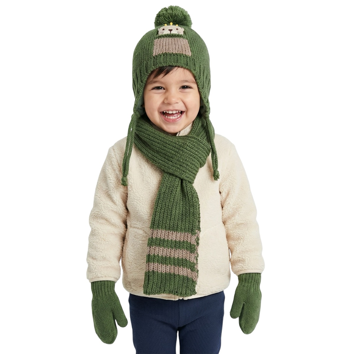 Για τους μικρούς που αγαπούν τις ζωηρές αποχρώσεις, το πλεκτό σετ σκούφος-κασκόλ-γάντια της Kitti σε πράσινο χρώμα προσφέρει ιδανικό συνδυασμό άνεσης και παιχνιδιάρικου στιλ. Το σκουφάκι με το απλικέ σχέδιο και τη μεγάλη φούντα στο επάνω μέρος δίνει ξεχωριστό χαρακτήρα, ενώ το ασορτί κασκόλ και τα γάντια προστατεύουν αποτελεσματικά από το κρύο. Η σύνθεση από 100% ακρυλικό εξασφαλίζει απαλή υφή και αντοχή, ιδανική για καθημερινή χρήση τον χειμώνα. Ένα σετ που θα συνοδεύσει τα αγόρια σε κάθε τους χειμερινή περιπέτεια, προσφέροντας ζεστασιά και στιλ.