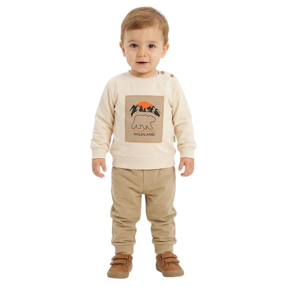Η βρεφική φορμούλα Memoza είναι η τέλεια επιλογή για άνεση και στυλ στις μεταβατικές εποχές. Η φούτερ μπλουζίτσα σε μπεζ απόχρωση, από 100% βαμβάκι, διαθέτει τύπωμα στο μπροστινό μέρος. Το καφέ παντελόνι, επίσης από 100% βαμβάκι, προσφέρει απόλυτη ελευθερία κινήσεων χάρη στο λάστιχο στη μέση και στο τελείωμα, εξασφαλίζοντας σταθερή εφαρμογή. Ένα κομψό και πρακτικό σύνολο που συνδυάζει άνεση, απαλότητα και μοντέρνο ύφος, ιδανικό για καθημερινές δραστηριότητες του μωρού σας την άνοιξη και το φθινόπωρο.
