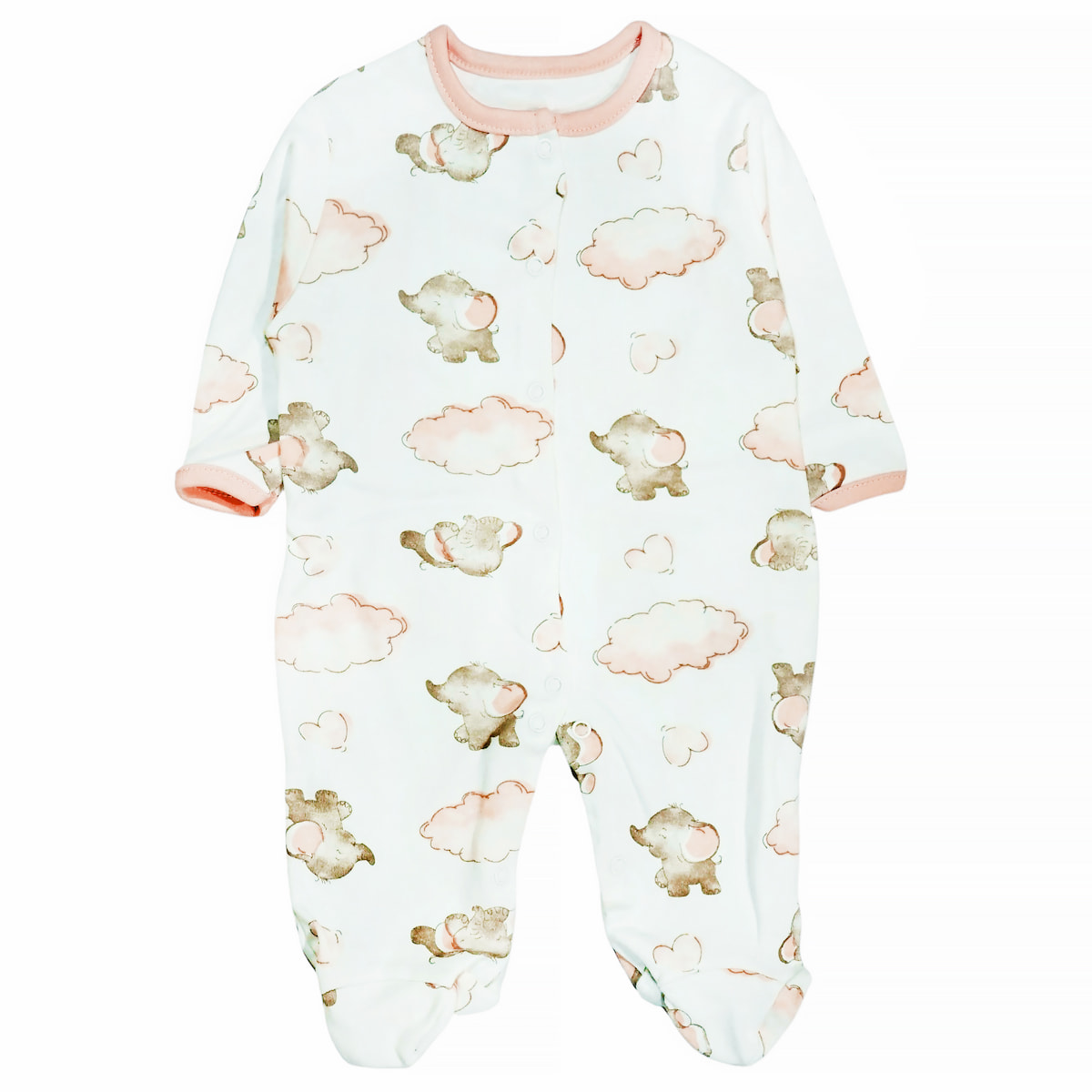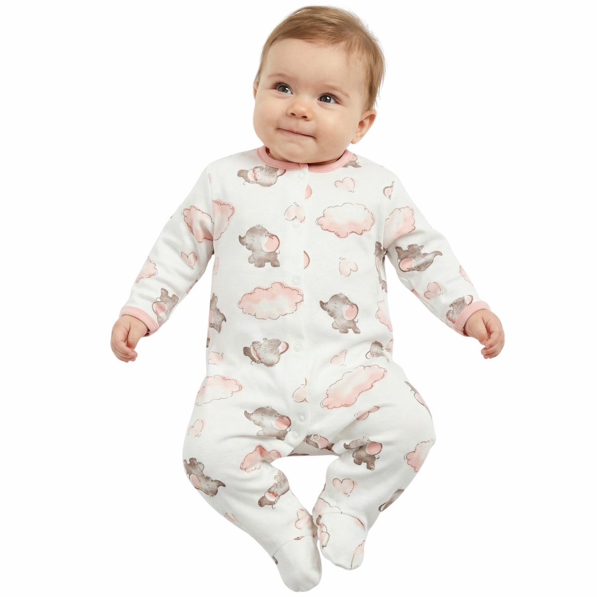 Το λεπτό φορμάκι από τη Midirik σε εκρού απόχρωση είναι μια γλυκιά και τρυφερή επιλογή για να συνοδεύσει τις ανοιξιάτικες και φθινοπωρινές στιγμές του κοριτσιού σας. Το χαριτωμένο μοτίβο με τα ελεφαντάκια που καλύπτει όλη την επιφάνεια του υφάσματος προσδίδει μια παιχνιδιάρικη διάθεση, κάνοντας τη μικρή σας να δείχνει αξιολάτρευτη είτε στην κούνια είτε στην αγκαλιά σας. Η σύνθεσή του από 100% βαμβάκι φροντίζει να αγγίζει το ευαίσθητο δέρμα της με φυσικό τρόπο, χαρίζοντας την απαλότητα και την ηρεμία που χρειάζεται. Για τη δική σας διευκόλυνση, τα τρουκς που ανοίγουν σε όλο το μήκος, από πάνω έως κάτω, κάνουν την αλλαγή της πάνας μια γρήγορη και απλή διαδικασία, ώστε να απολαμβάνετε περισσότερο χρόνο παιχνιδιού με το μωρό σας.