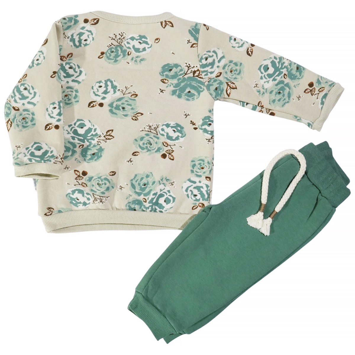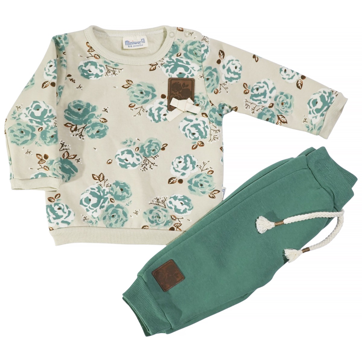 Το βρεφικό σετ φόρμας της Miniworld συνδυάζει μπεζ μπλούζα και πράσινο παντελόνι, δημιουργώντας μια φρέσκια και ξεχωριστή εμφάνιση για το μικρό σας κοριτσάκι. Η μπλούζα ξεχωρίζει με το όμορφο τύπωμα με λουλούδια all over, ενώ διαθέτει λάστιχο στο λαιμό, στα μανίκια και περιμετρικά στο τελείωμα για άνετη και ασφαλή εφαρμογή. Το πράσινο παντελόνι έχει λάστιχο περιμετρικά στη μέση και στο τελείωμα, εξασφαλίζοντας ελευθερία κινήσεων κατά τη διάρκεια του παιχνιδιού. Και τα δύο κομμάτια φέρουν εσωτερικό με χνούδι που προσφέρει επιπλέον ζεστασιά και προστασία από το κρύο. Κατασκευασμένο από 70% βαμβάκι και 30% πολυεστέρα, το σετ είναι απαλό, ανθεκτικό και ιδανικό για καθημερινή χρήση στο σπίτι ή έξω.