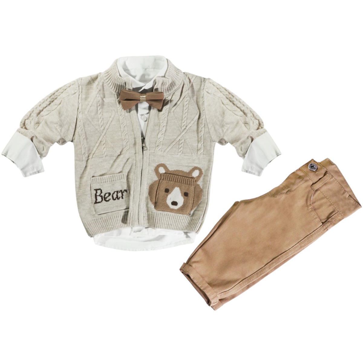 Το σετ Nowa Kids περιλαμβάνει τέσσερα αμπιγιέ ρούχα για αγόρια: ζακέτα, πουκάμισο, παντελόνι και παπιγιόν. Η μπεζ πλεκτή ζακετούλα διαθέτει φερμουάρ και τσεπούλες για πρακτικότητα και κομψότητα. Το πουκάμισο σε λευκό χρώμα είναι ιδανικό για κάθε επίσημη εμφάνιση. Το καφέ παντελόνι διαθέτει λάστιχο στη μέση που αυξομειώνει εσωτερικά, εξασφαλίζοντας άνετη εφαρμογή σε κάθε παιδί. Το σετ ολοκληρώνεται με παπιγιόν με λάστιχο, που δίνει μια επίσημη και ιδιαίτερη πινελιά στο ντύσιμο. Η σύνθεση υφασμάτων προσφέρει άνεση και αντοχή: ζακέτα από 70% ακρυλικό και 30% βαμβάκι, πουκάμισο από 70% βαμβάκι και 30% ελαστάνη, παντελόνι από 98% βαμβάκι και 2% ελαστάνη. Ένα ολοκληρωμένο χειμερινό αμπιγιέ σετ που συνδυάζει στιλ, πρακτικότητα και ποιότητα για κάθε ξεχωριστή περίσταση.