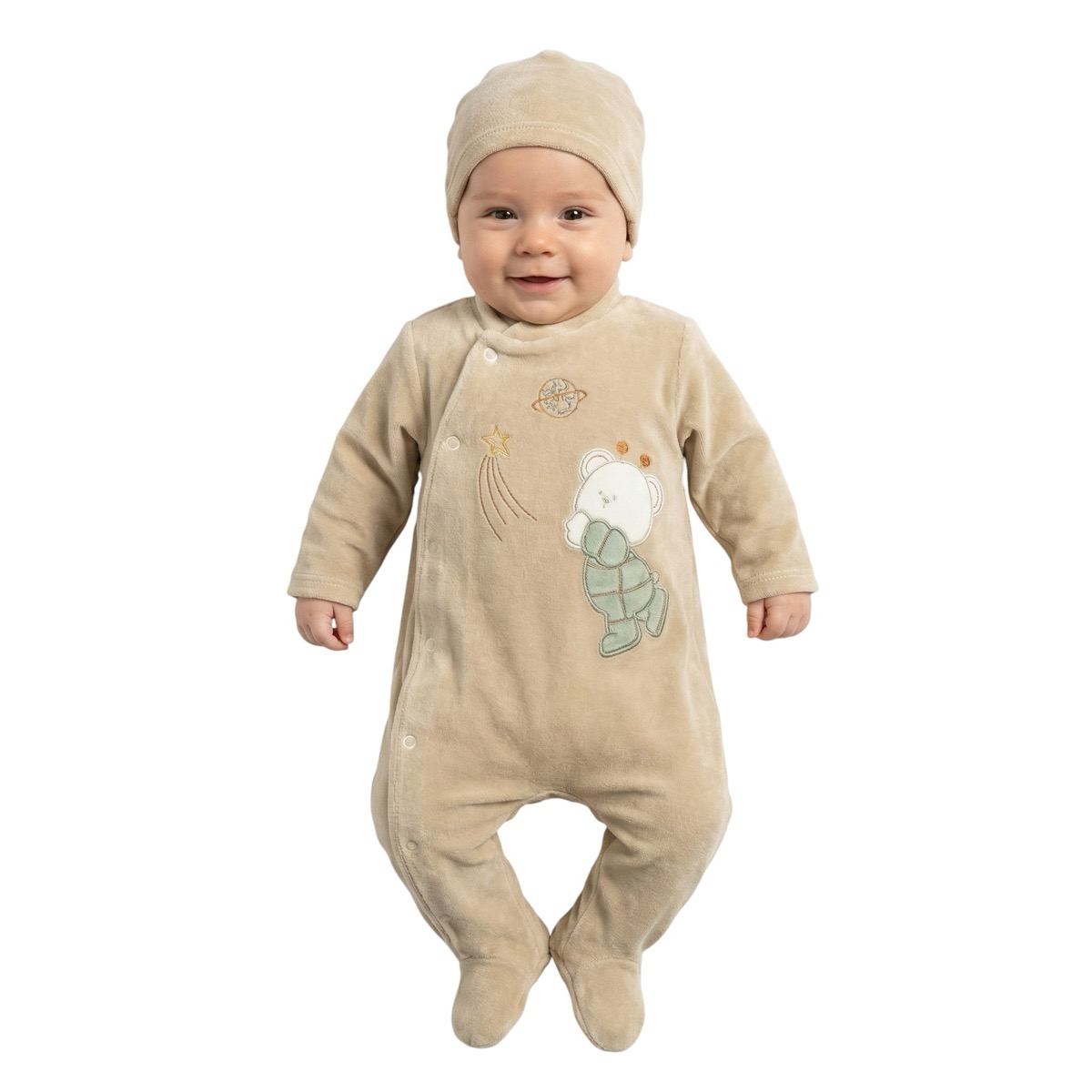 Pera Bebe ολόσωμο βελουτέ φορμάκι με σκουφάκι «Space Beige Teddy»