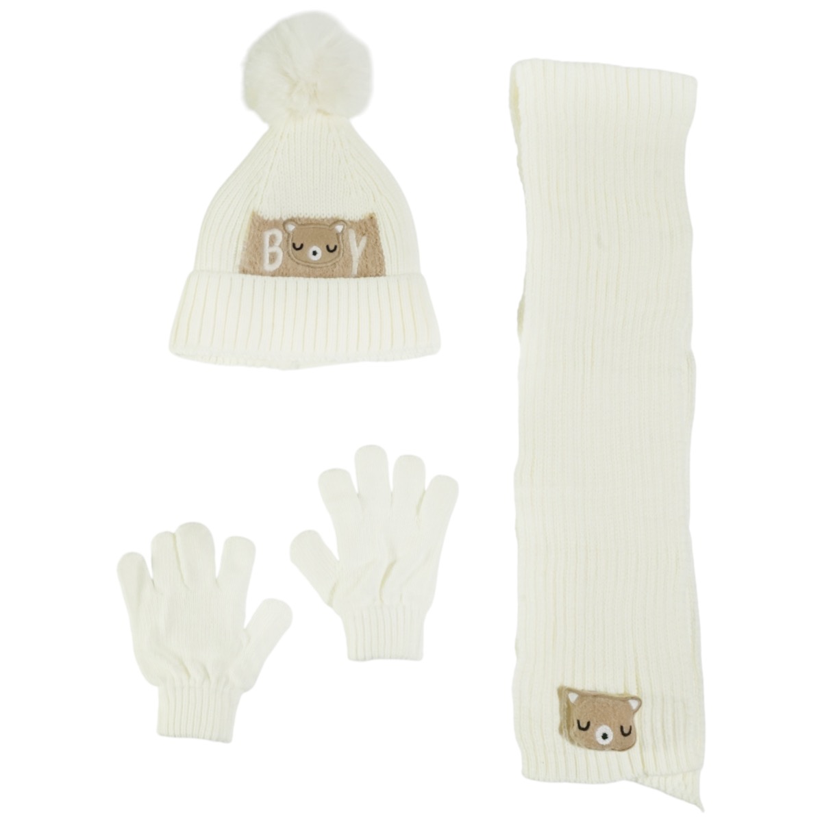 Για τους μικρούς σας που αγαπούν την άνεση και το στιλ, το πλεκτό σετ της Recos σε εκρού χρώμα είναι η τέλεια επιλογή για τις κρύες ημέρες του χειμώνα. Κατασκευασμένο από 100% ακρυλικό, το μαλακό και χοντρό νήμα προσφέρει απαλή αίσθηση και αποτελεσματική προστασία από το κρύο. Το σκουφάκι ξεχωρίζει με ένα στιλάτο απλικέ σχέδιο στο μπροστινό μέρος και μια εντυπωσιακή φούντα στην κορυφή, ενώ η εσωτερική επένδυση από fleece εξασφαλίζει επιπλέον ζεστασιά και άνεση. Το κασκόλ και τα γάντια, από το ίδιο νήμα, συμπληρώνουν το σετ, προσφέροντας στα αγοράκια σας ένα ολοκληρωμένο και πρακτικό σύνολο που συνδυάζεται εύκολα με όλα τους τα ρούχα, κρατώντας τα ζεστά και έτοιμα για κάθε τους περιπέτεια.