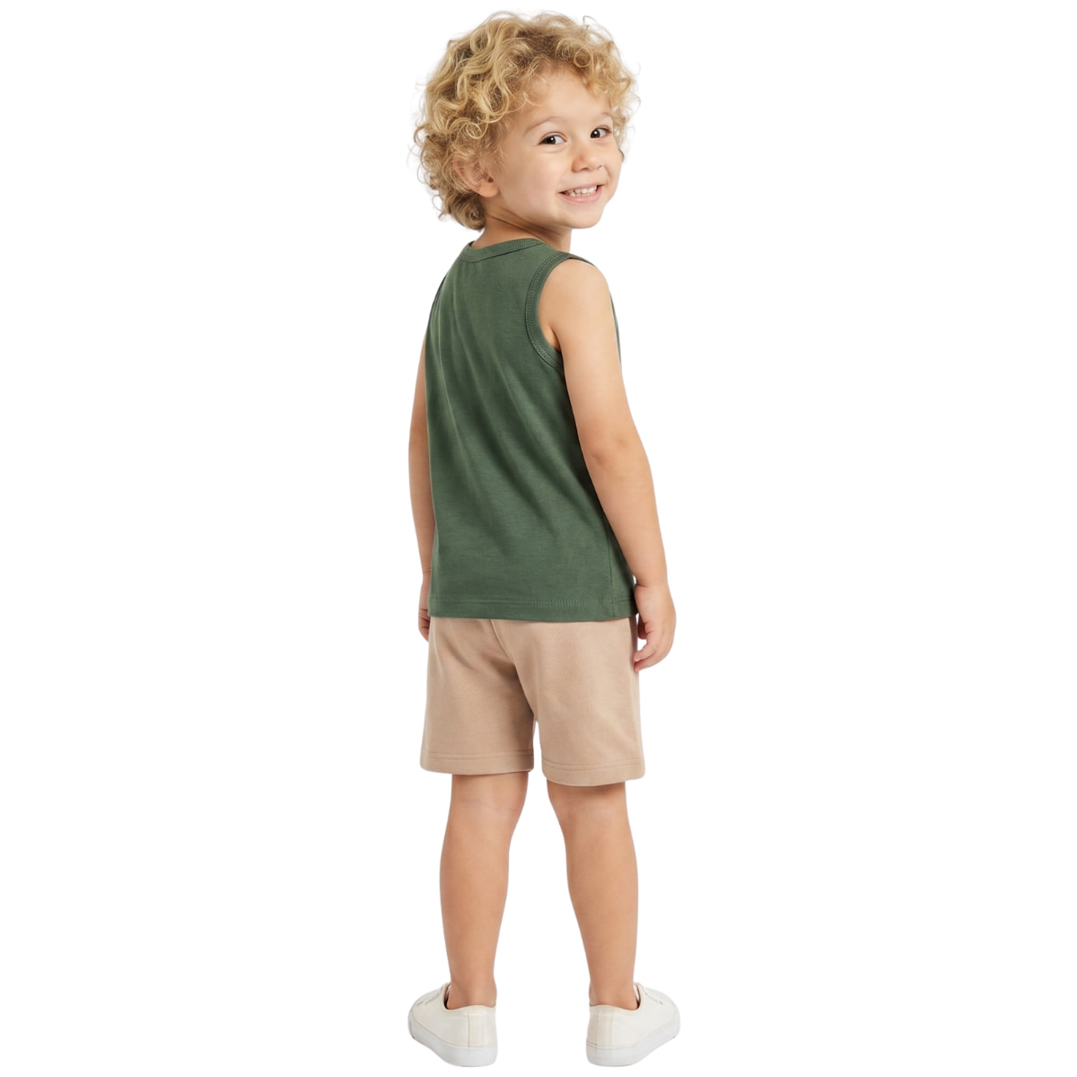 Ένα υπέροχο καλοκαιρινό σετ από την Trax υπόσχεται να γεμίσει με χαρά και άνεση την καθημερινότητα που έχουν τα αγοράκια σας. Το πράσινο αμάνικο μπλουζάκι κερδίζει αμέσως τις εντυπώσεις, καθώς το τύπωμα με τα ζωάκια στο μπροστινό μέρος χαρίζει μια πολύ παιχνιδιάρικη εικόνα στις βόλτες τους. Ταιριάζει απόλυτα με το μπεζ σορτσάκι, το οποίο διαθέτει ένα πρακτικό λάστιχο περιμετρικά στη μέση για να εφαρμόζει σταθερά, χωρίς να τα στενεύει την ώρα που τρέχουν και ανακαλύπτουν τον κόσμο. Καθώς το καλοκαίρι απαιτεί ανάλαφρη και δροσερή αίσθηση, τα ρούχα είναι ραμμένα εξ ολοκλήρου από 100% βαμβάκι, δημιουργώντας μια απόλυτα φιλική επαφή με το ευαίσθητο δερματάκι τους. Αυτή η σύνθεση τούς εξασφαλίζει όλη την ελευθερία κινήσεων που χρειάζονται, προσφέροντας μια εξαιρετικά πρακτική και πραγματικά στιλάτη πρόταση για τις διακοπές και το παιχνίδι στο πάρκο.