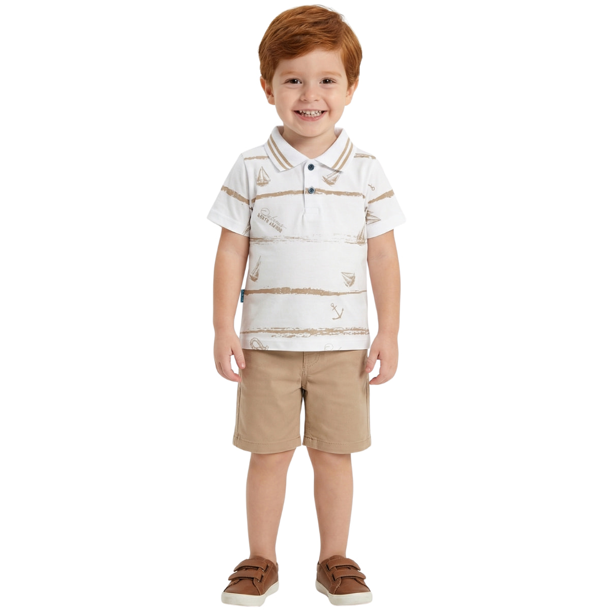 Ετοιμάστε τα αγοράκια σας για τις πιο όμορφες καλοκαιρινές εξόδους με αυτό το κομψό σετ από τη Yakup Bebe. Η λευκή κοντομάνικη πόλο μπλούζα ξεχωρίζει αμέσως, καθώς το χαρούμενο τύπωμα με τα ιστιοφόρα δίνει μια υπέροχη ναυτική νότα στις καθημερινές τους εμφανίσεις. Το ντύσιμο ολοκληρώνεται αρμονικά με την μπεζ βερμούδα, η οποία διαθέτει κλασικό άνοιγμα με κουμπί, αλλά και πρακτικές τσέπες μπροστά και πίσω. Για να προσφέρει την απόλυτη άνεση, στο εσωτερικό της κρύβει ένα βολικό λάστιχο που αυξομειώνει, βοηθώντας σας να προσαρμόσετε εύκολα την εφαρμογή στη μέση τους, ώστε να παίζουν ελεύθερα και χωρίς πίεση. Γνωρίζοντας πως ο ζεστός καιρός απαιτεί δροσιά, τα ρούχα είναι ραμμένα αποκλειστικά από 100% βαμβάκι. Αυτή η φυσική επιλογή αγκαλιάζει απαλά το ευαίσθητο δερματάκι τους, χαρίζοντας στους μικρούς σας ένα πραγματικά στιλάτο αποτέλεσμα για τις διακοπές και τις βόλτες στο νησί.
